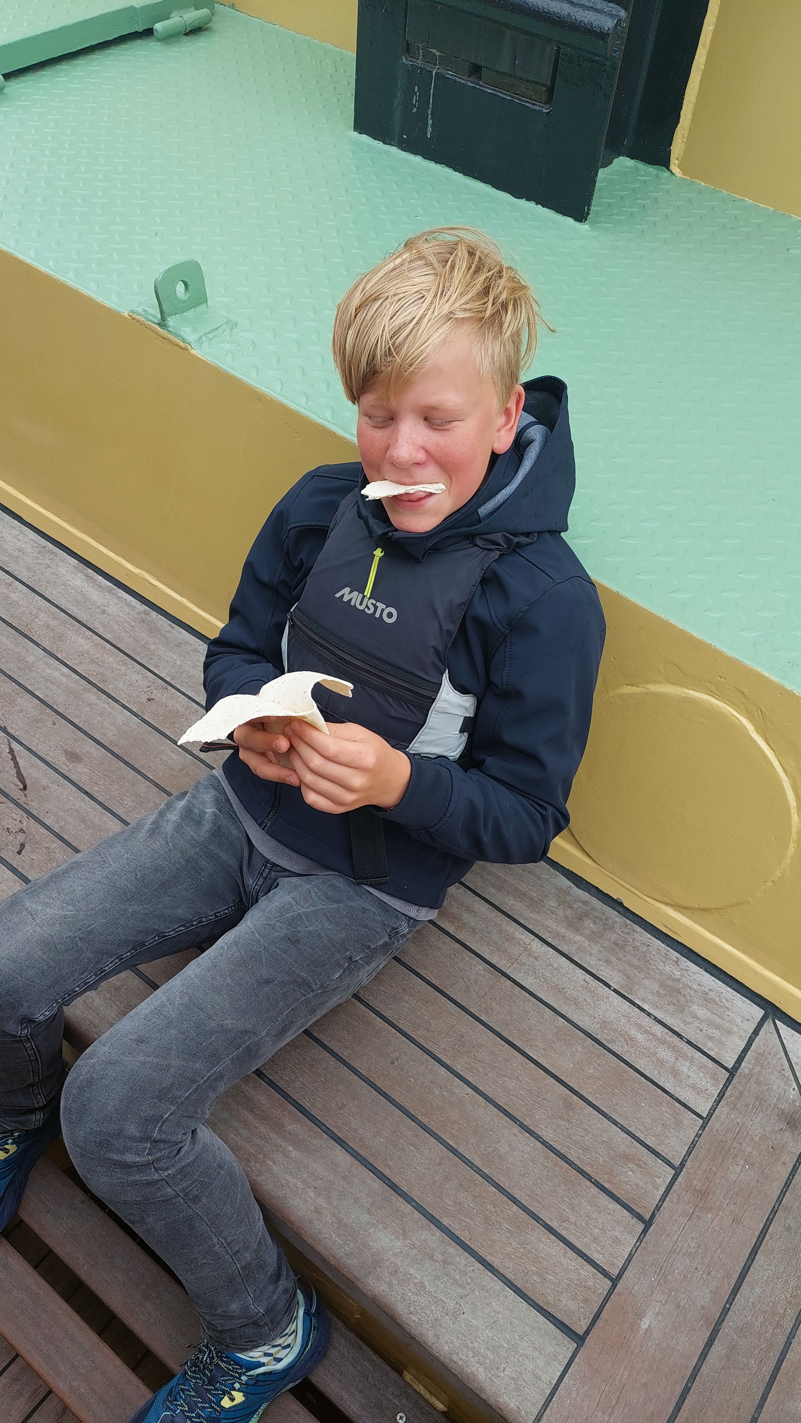 Direkt nach der Schleuse, auf Backbord im Schutz des Deichs, fiel der Anker und es konnte wieder ausgiebig vom Schiff aus gebadet werden. Über eine Stunde, dann wurde es Zeit aufzubrechen. Denn schließlich war fürs Abendessen schon frischer Kibbeling vorbestellt. Vorher aber noch eben die Reste der Spaghettis von gestern verdrückt.