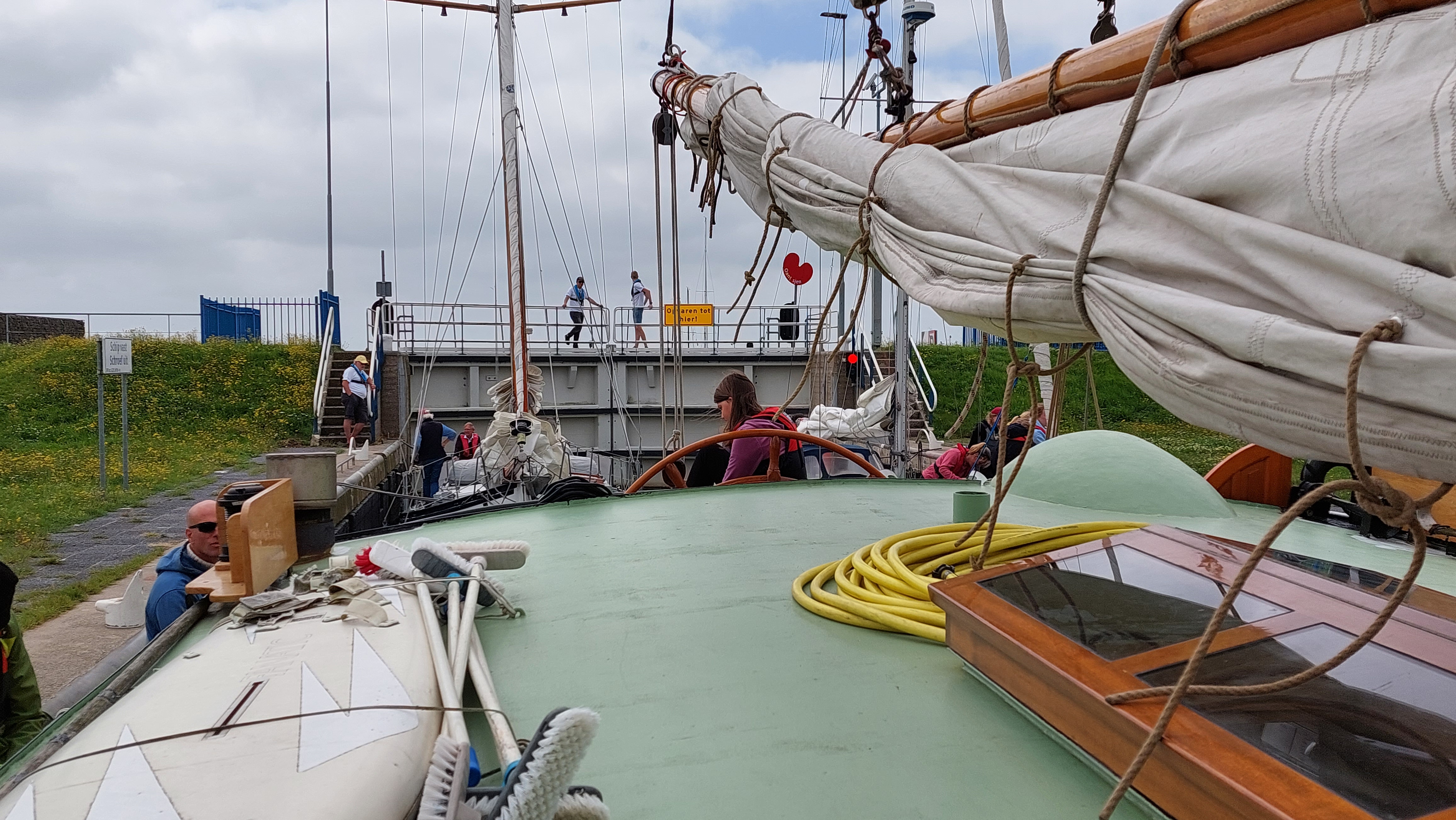 Es ging zurück durch den Jan-Frisio-Kanaal Richtung Stavoren. Natürlich unter Segeln - Fock und Groß. In der Schleuse war dann ca 15 Minuten Warten angesagt, dem Samstagsverkehr geschuldet.