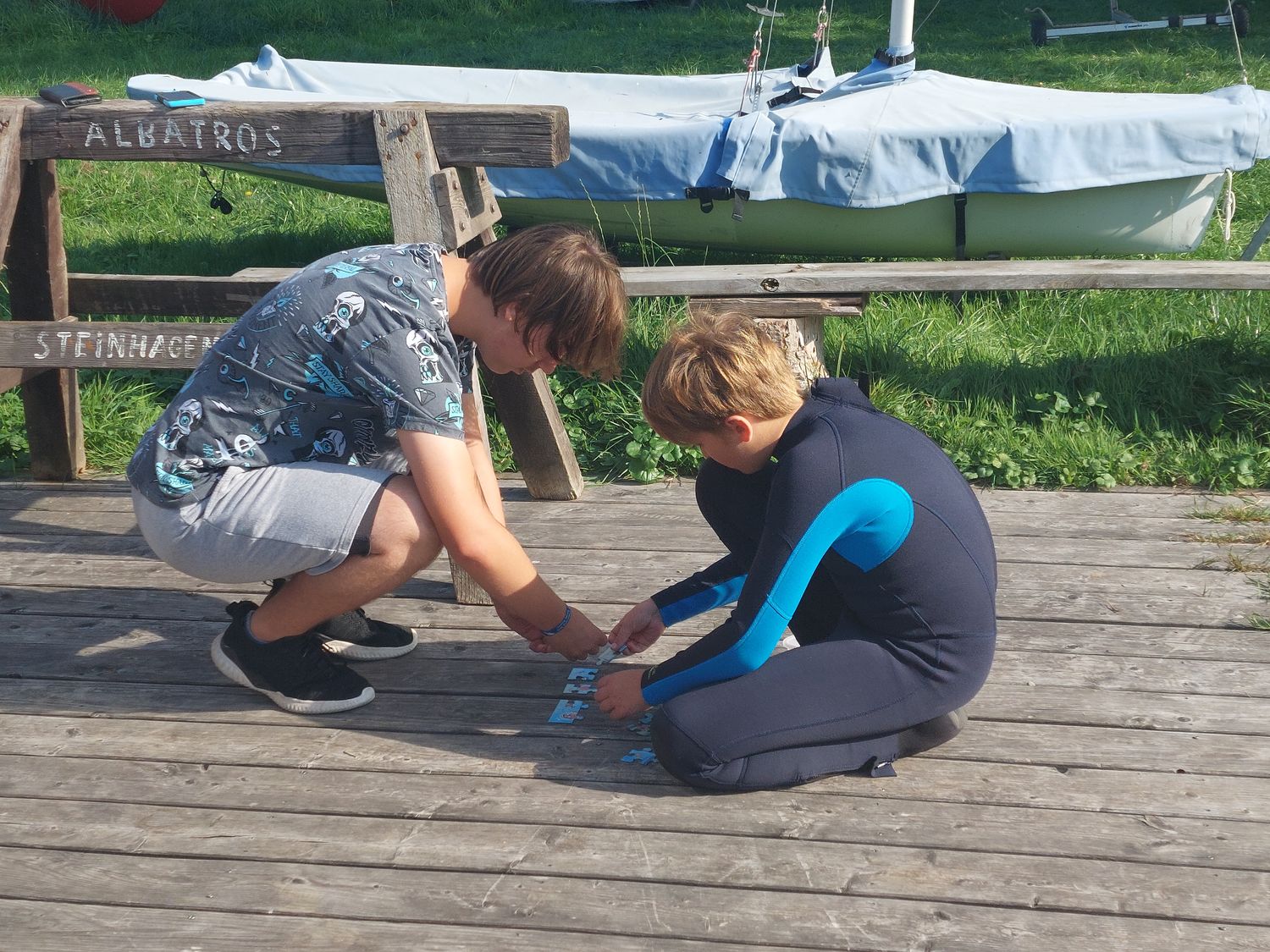 Neben Segeln standen Spiel und Spaß im Vordergrund. In 2 Teams mit den Enten-Maskottchen "Hildegard" und "Hans Wurst" mußten die Sailkids diverse Aufgabe erledigen und konnten dafür jeweils einige Teile eines Puzzles ergattern.