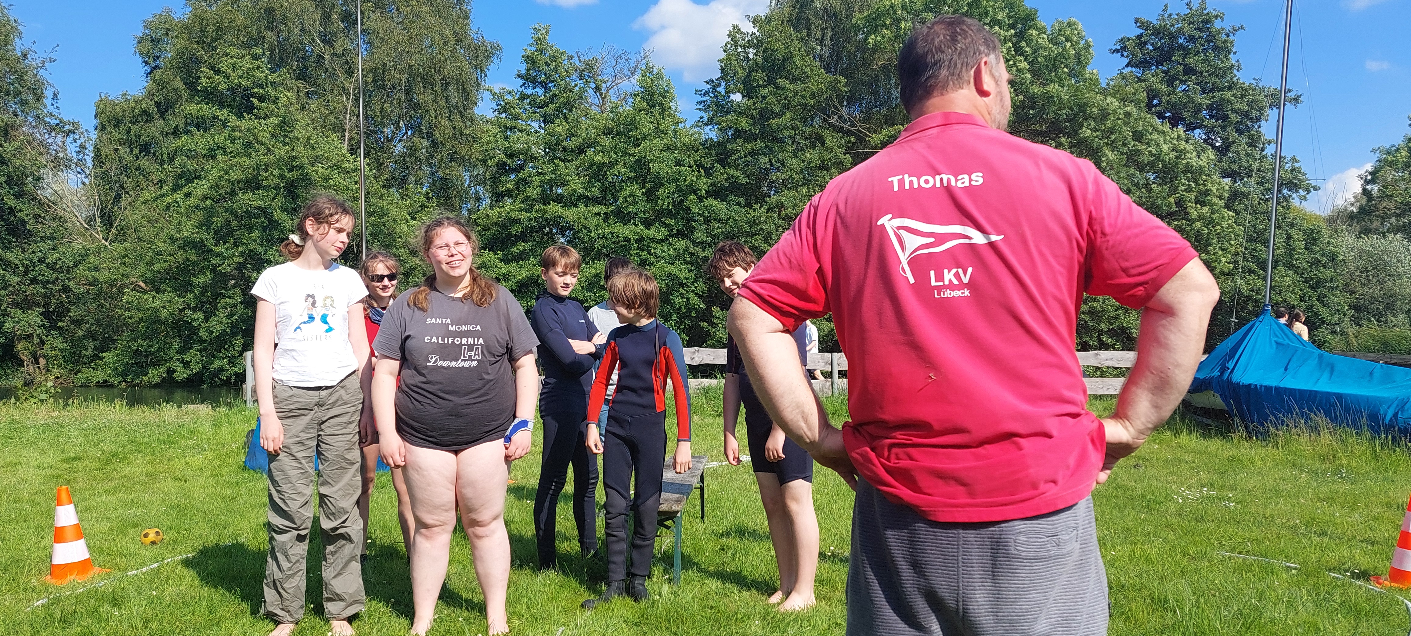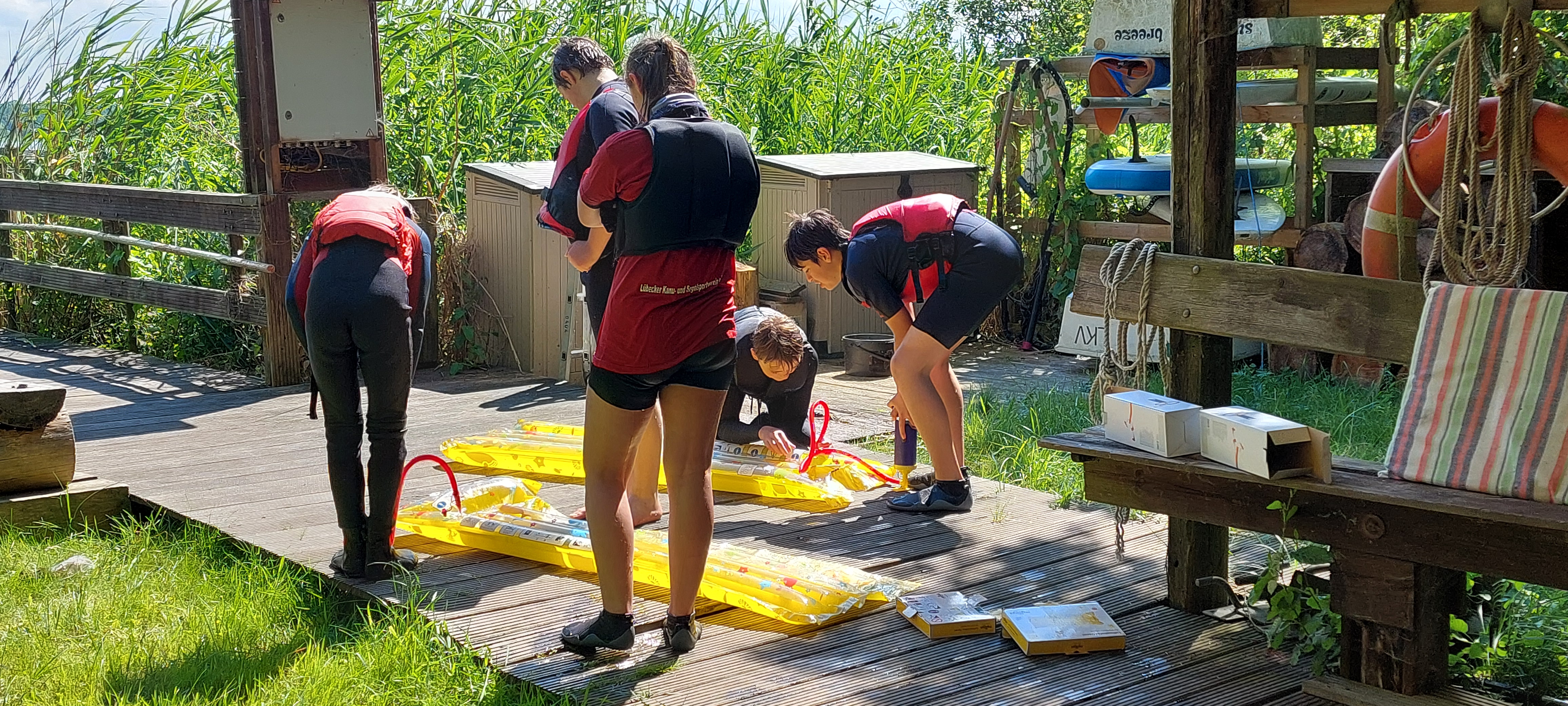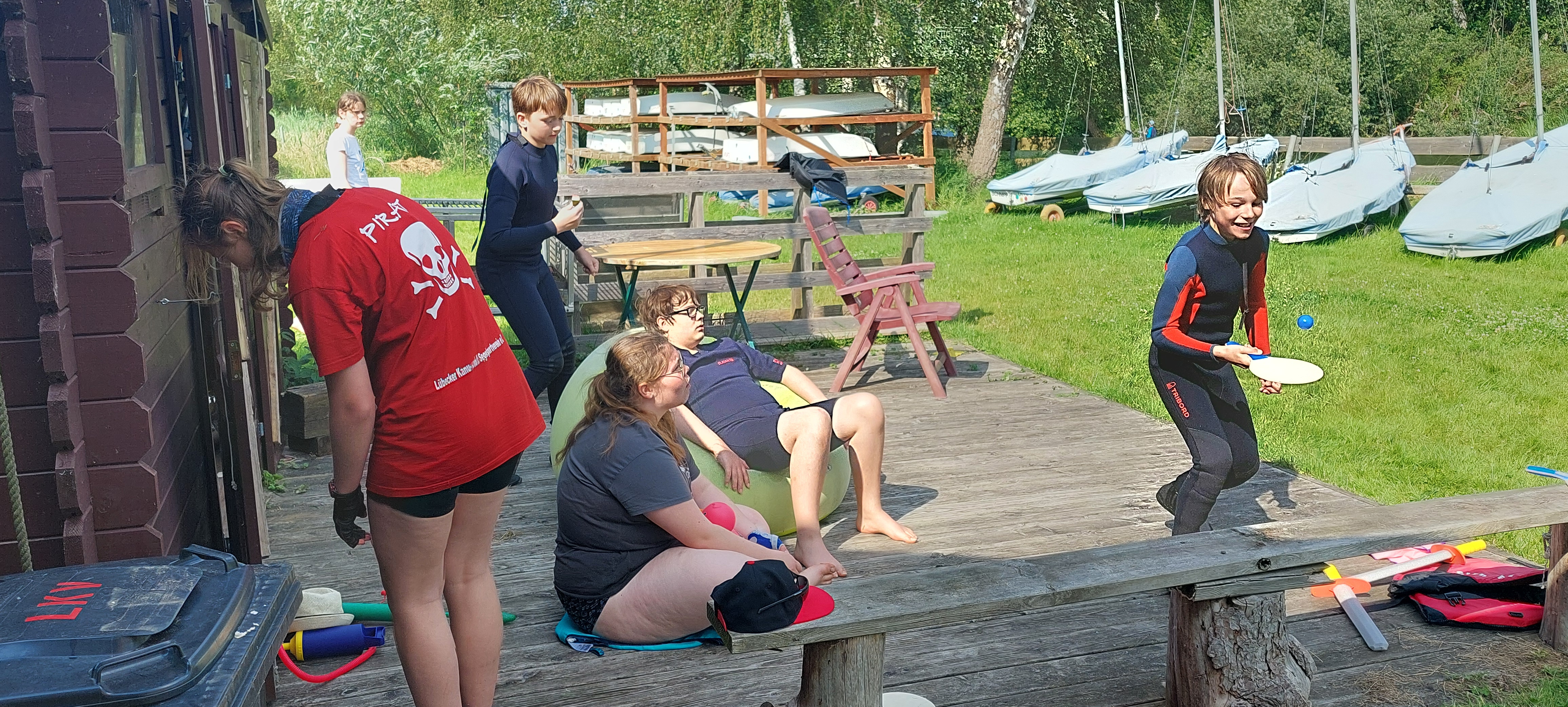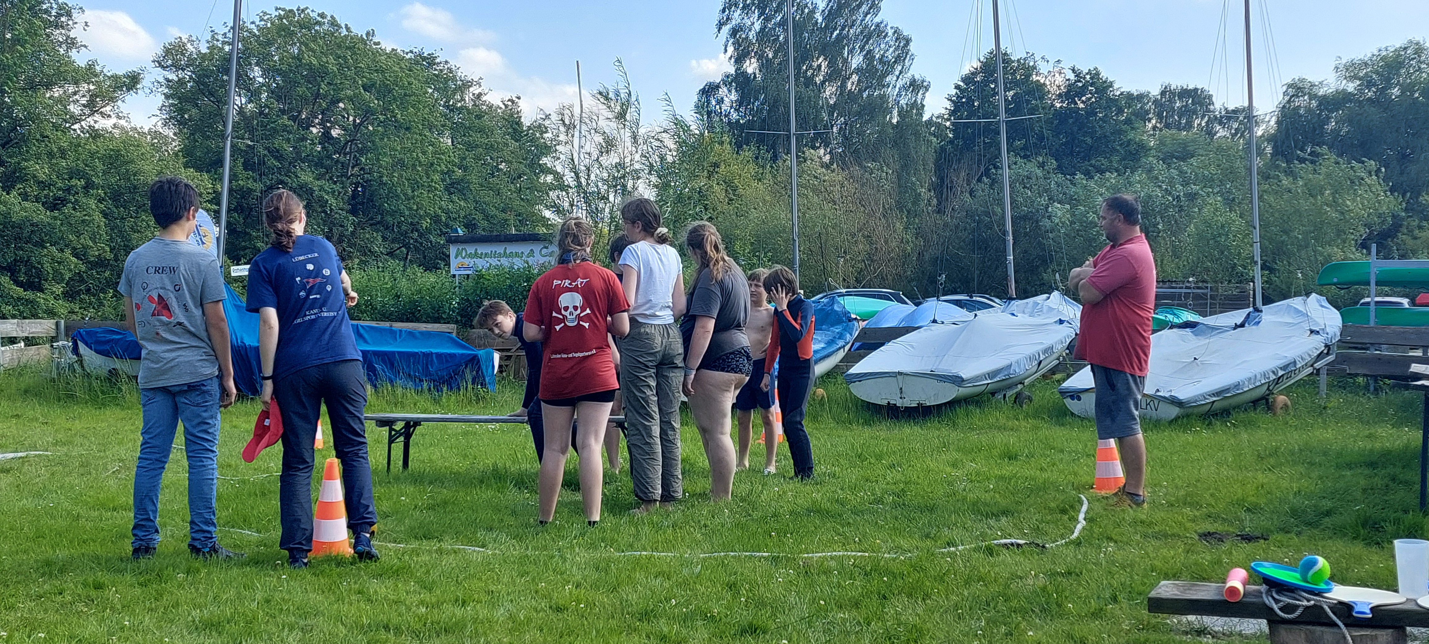 Und das Fazit daraus? Dann nutzen wir die Zeit halt mit noch mehr Spaß und Spiel rund um das Wasser. Mit dem Wetter hatten wir dann auch noch Glück - passend zum Start um 12 Uhr waren Regen und Wolken verzogen und stahlendstem Sonnenschein gewichen. Also war es warm genug für ausgiebige Aktionen in der Wakenitz, dem Ratzeburger See und an Land auf der Jollenwiese am Wakenitzhaus.