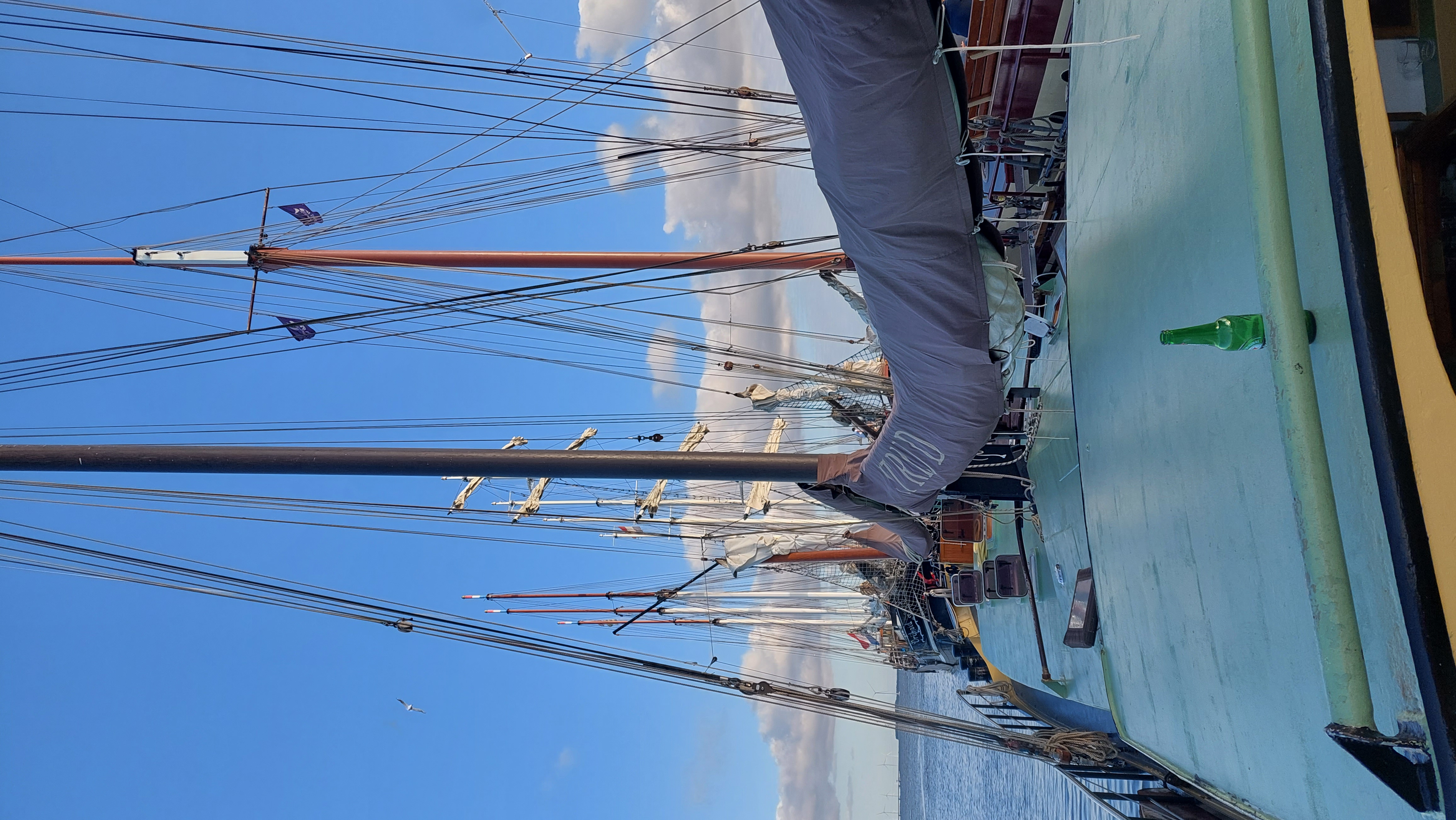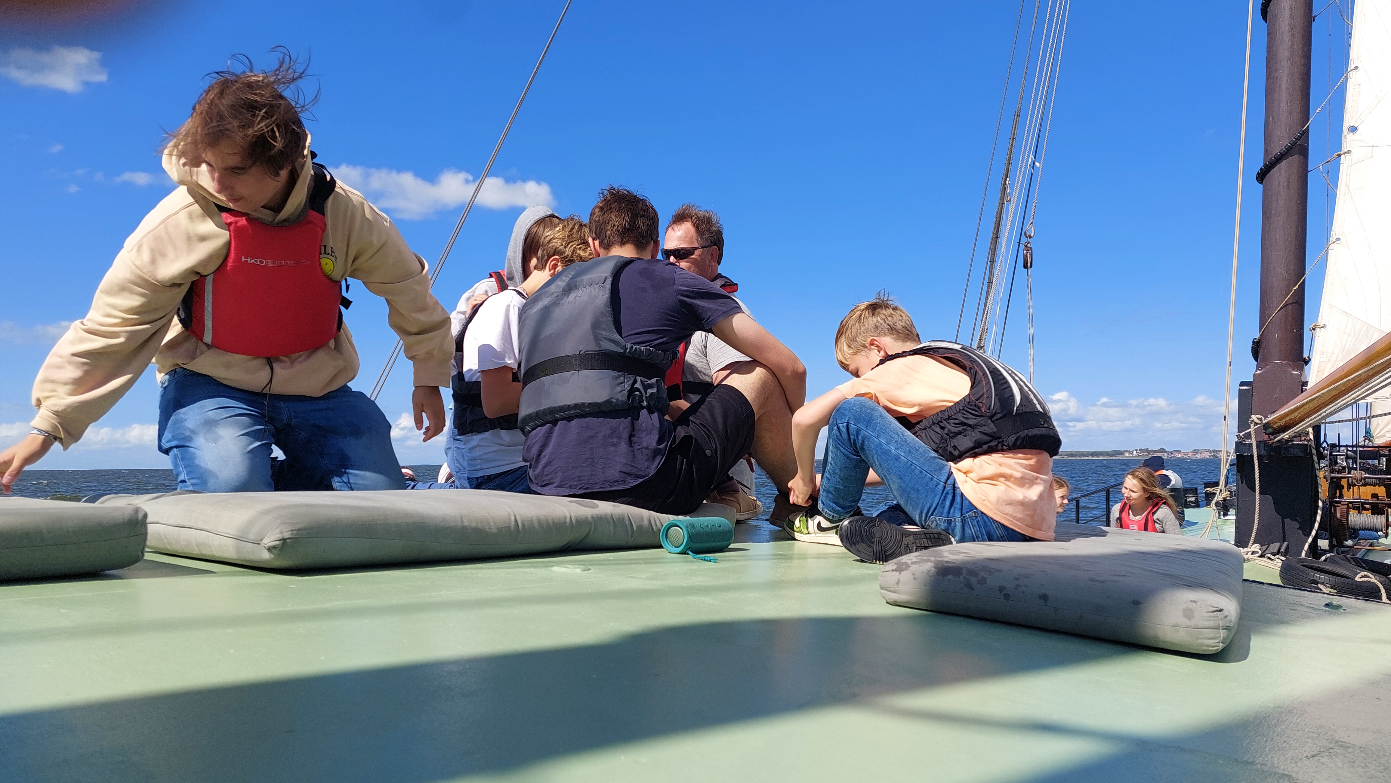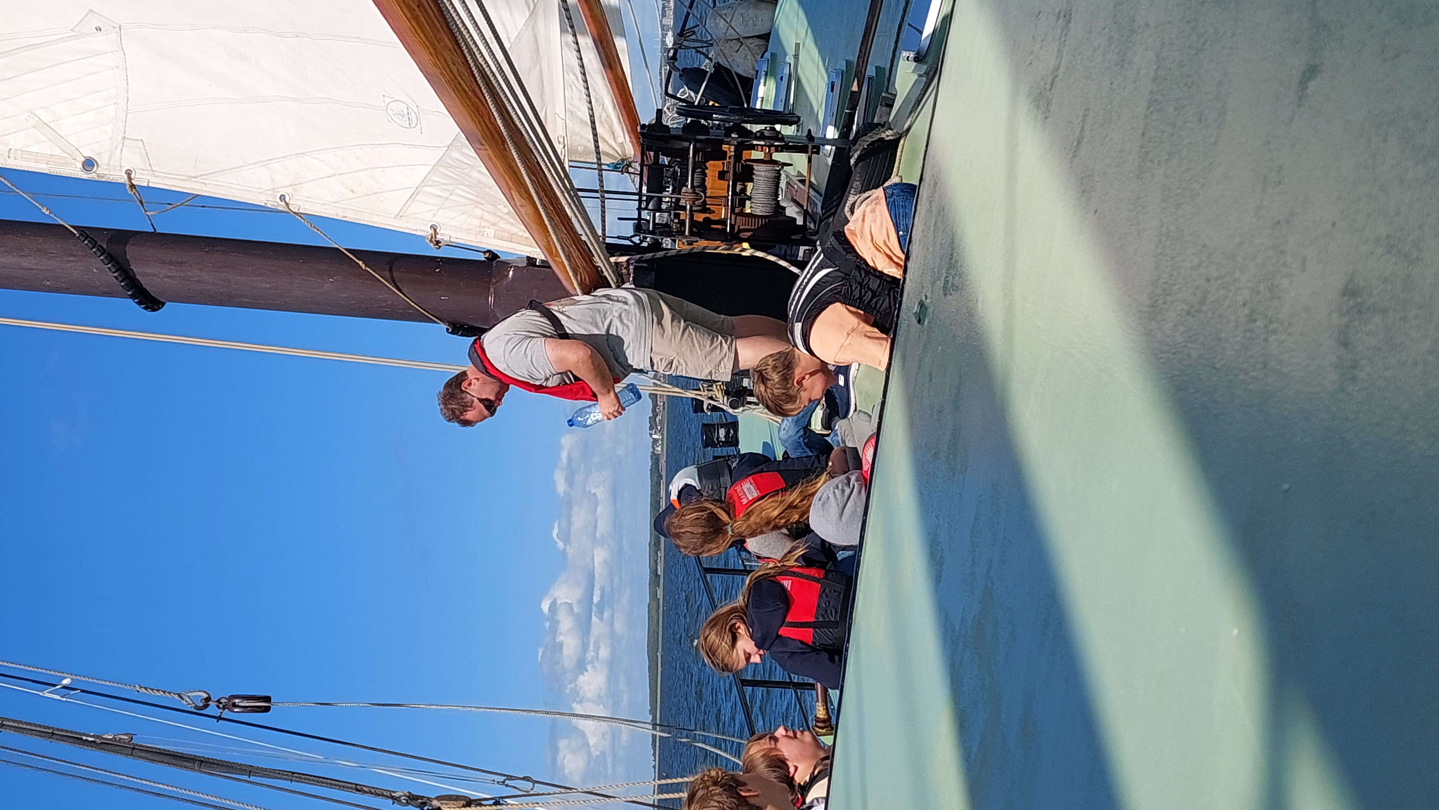 Nach knapp 2 Stunden konnten wir endlich Segel setzen. Klüver, Fock, Groß und Besan. Raumer Wind oder halberr Wind. 5 Knoten. Sonne, knapp 20 Grad.