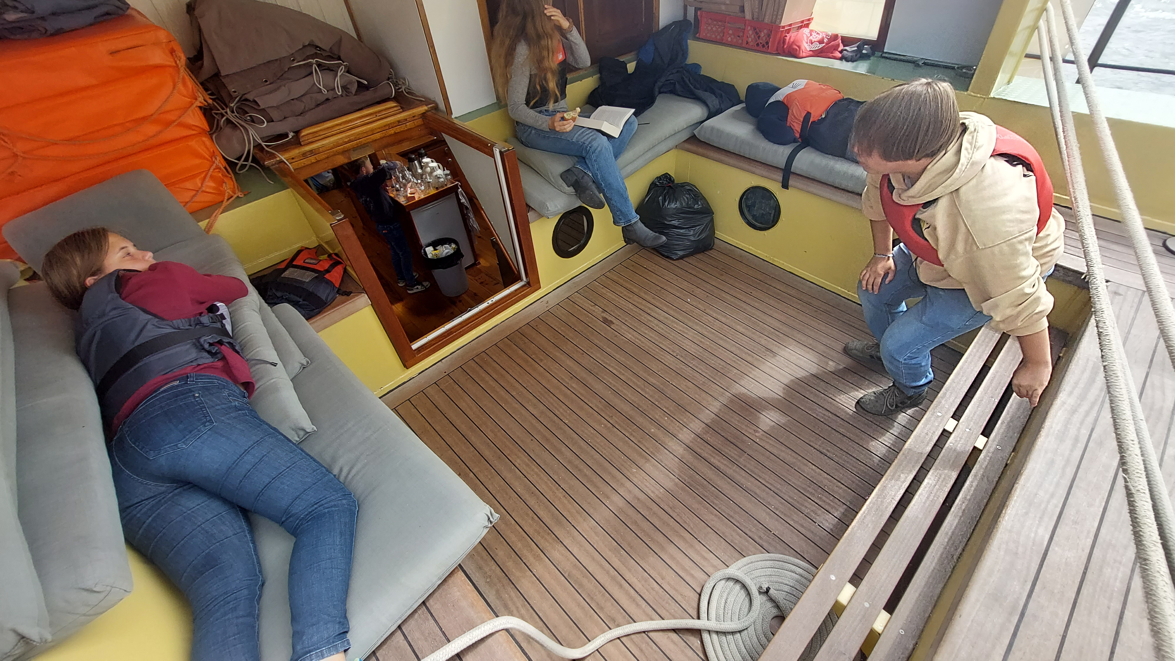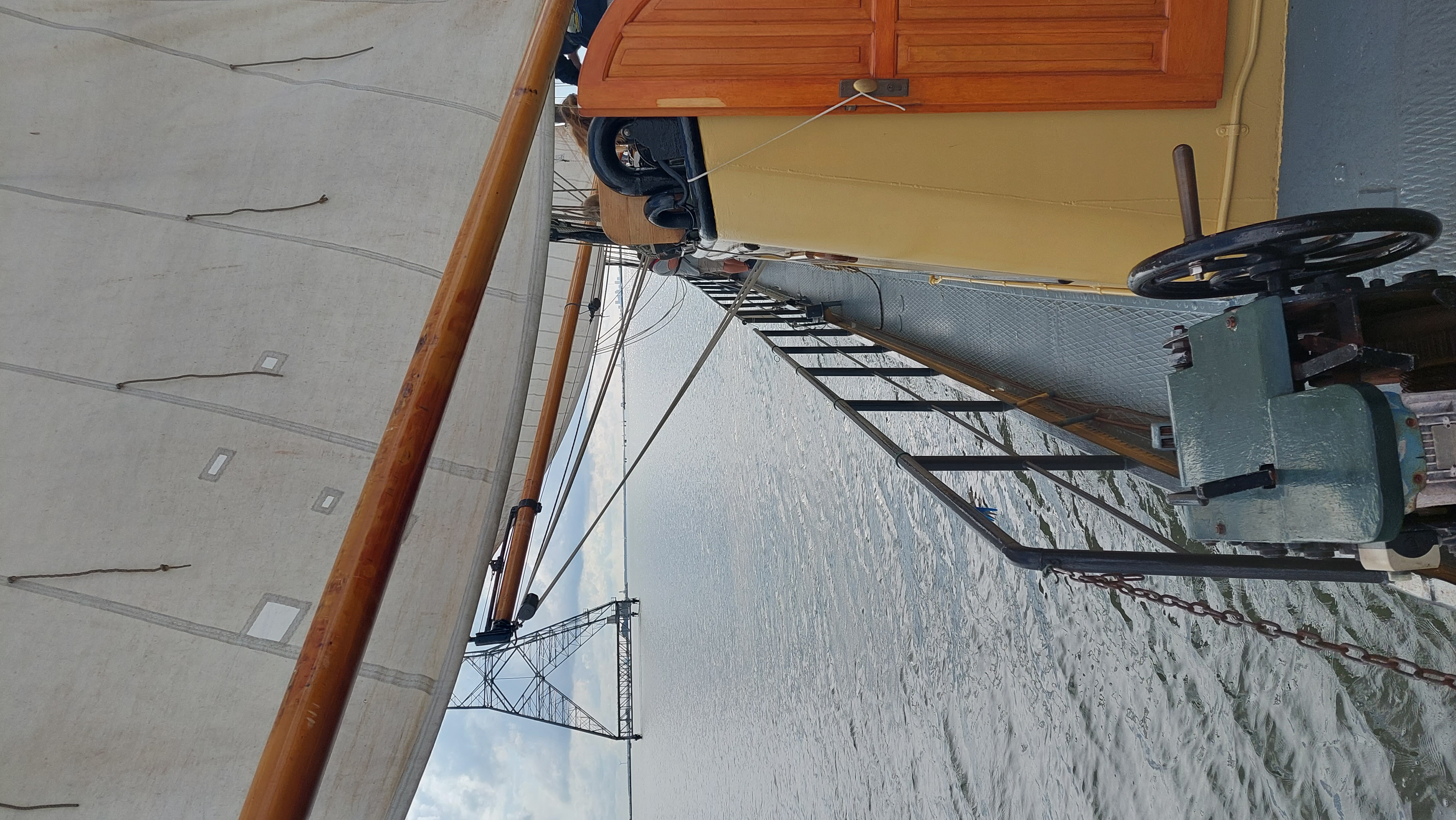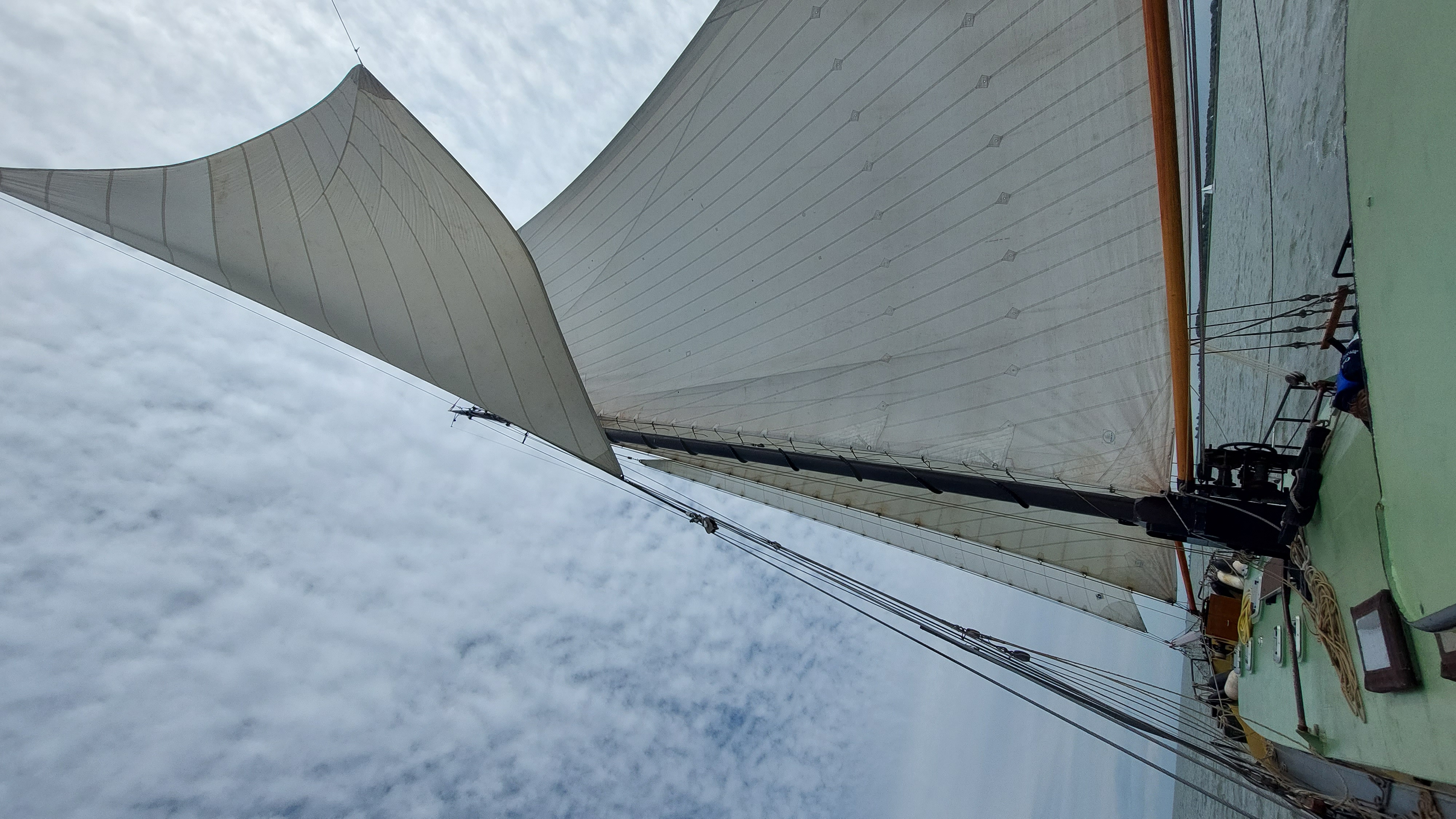 Nach knapp 2 Stunden konnten wir endlich Segel setzen. Klüver, Fock, Groß und Besan. Raumer Wind oder halberr Wind. 5 Knoten. Sonne, knapp 20 Grad.