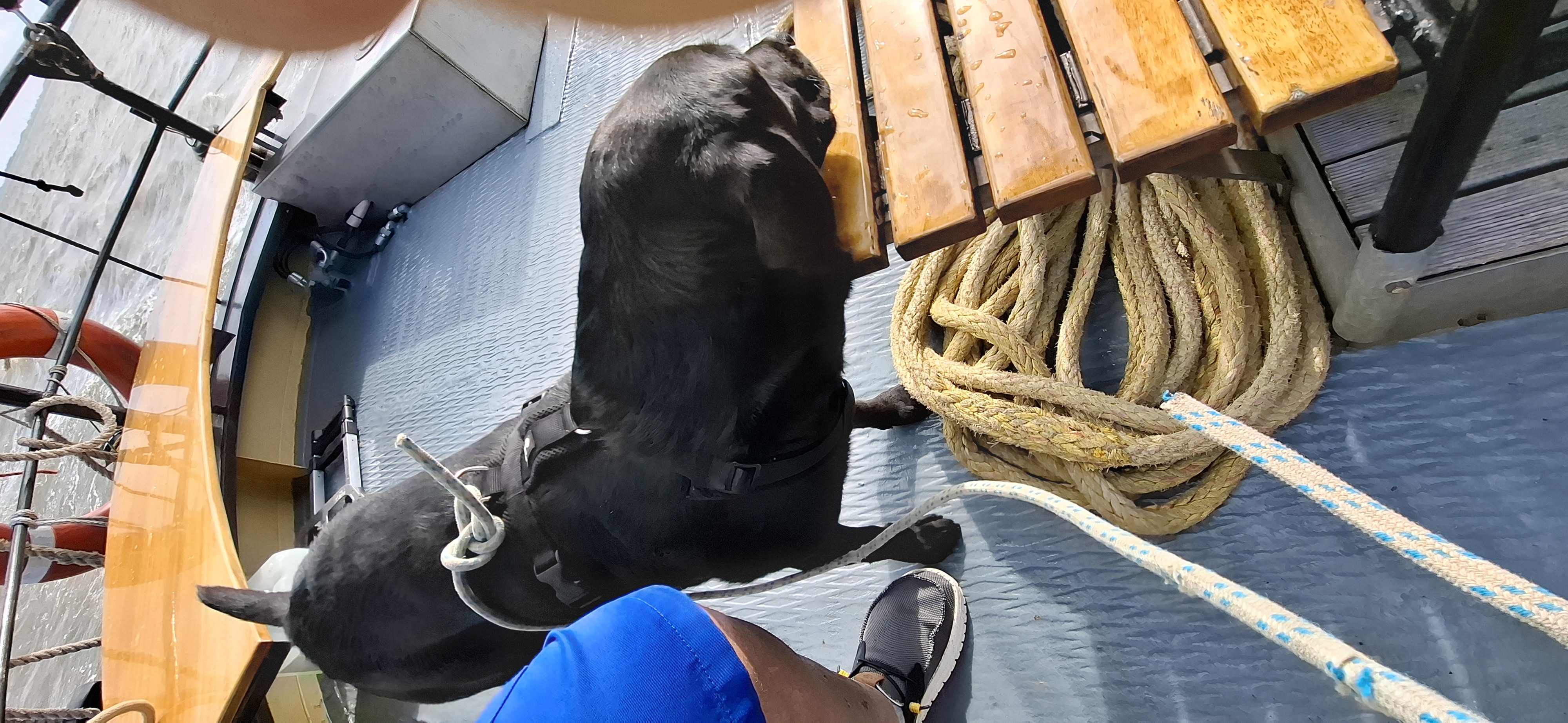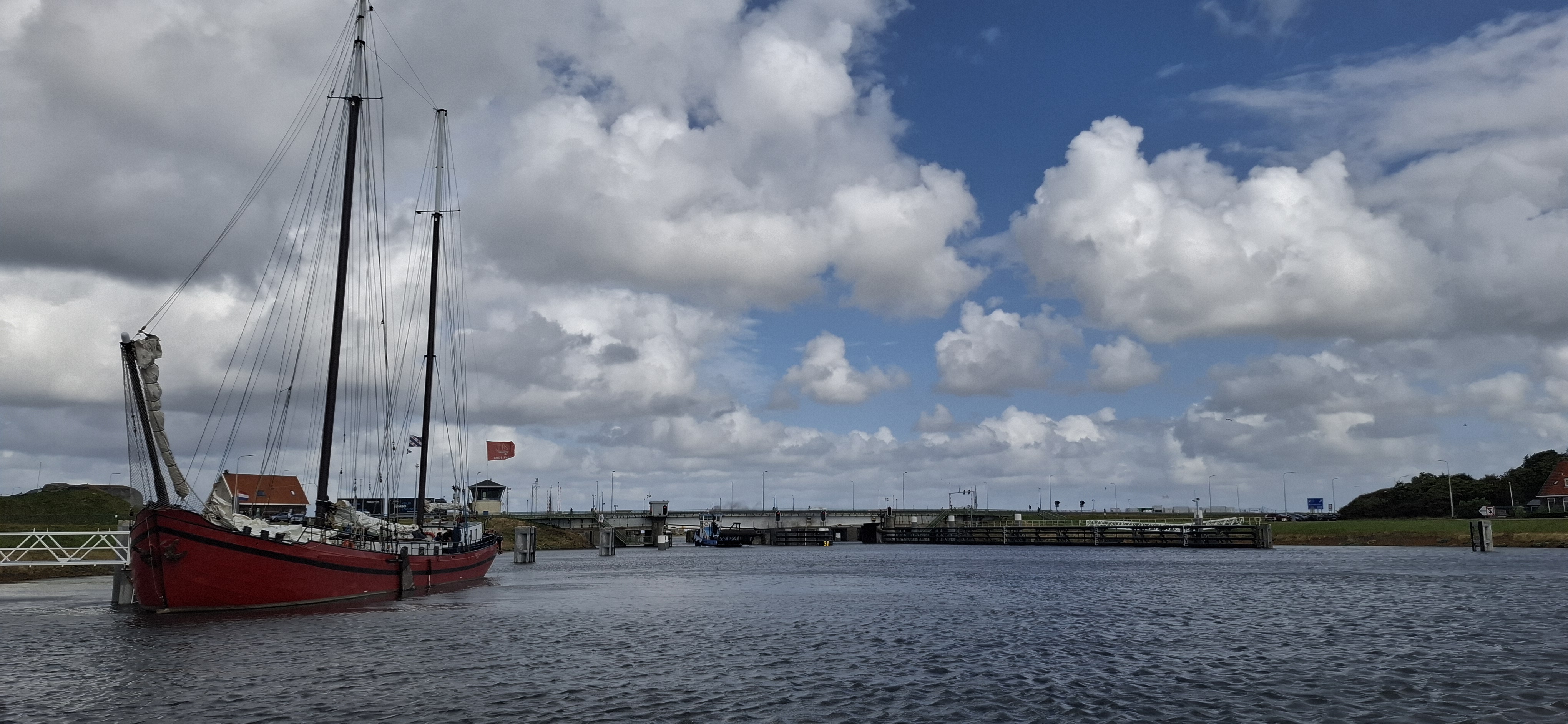 Im Hafen pfiff der Wind schon kräftig, im Außenhafen trafen uns die 5 mit stärkeren Böen. In weiser Voraussicht hatten wir gestern schon mal Groß und Besan gerefft. Heute erst mal nur Groß und Fock gesetzt. Dann hoch am Wind Richtung Schleuse Kornwarderzand.