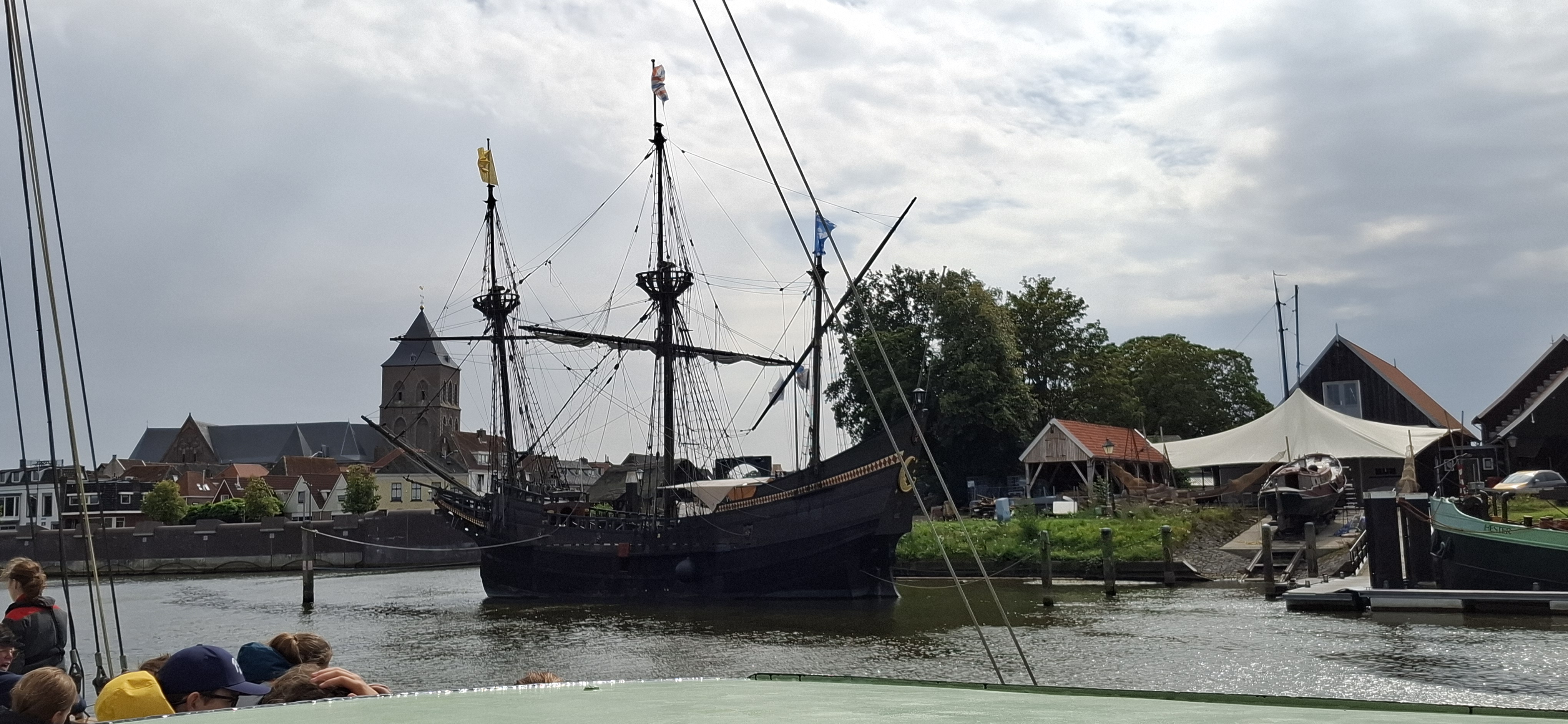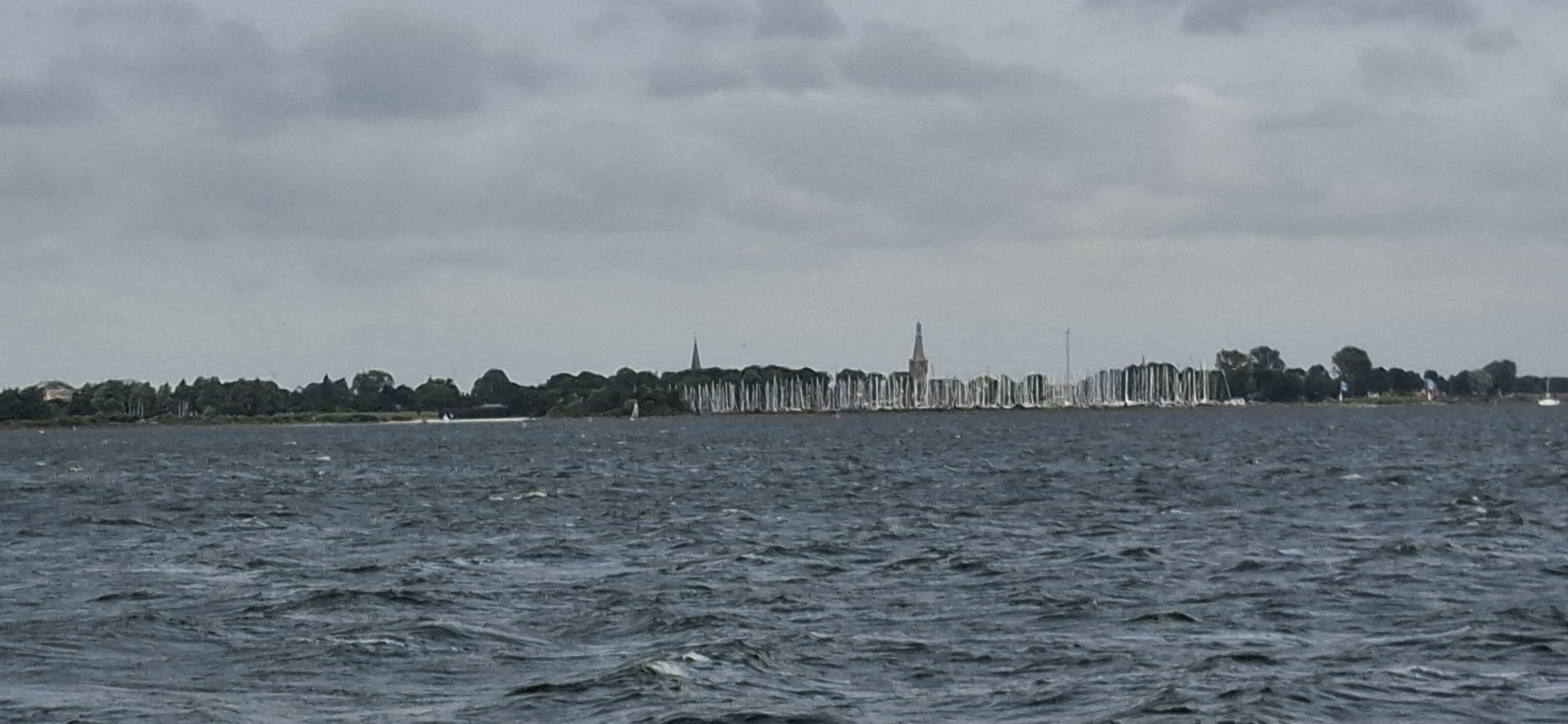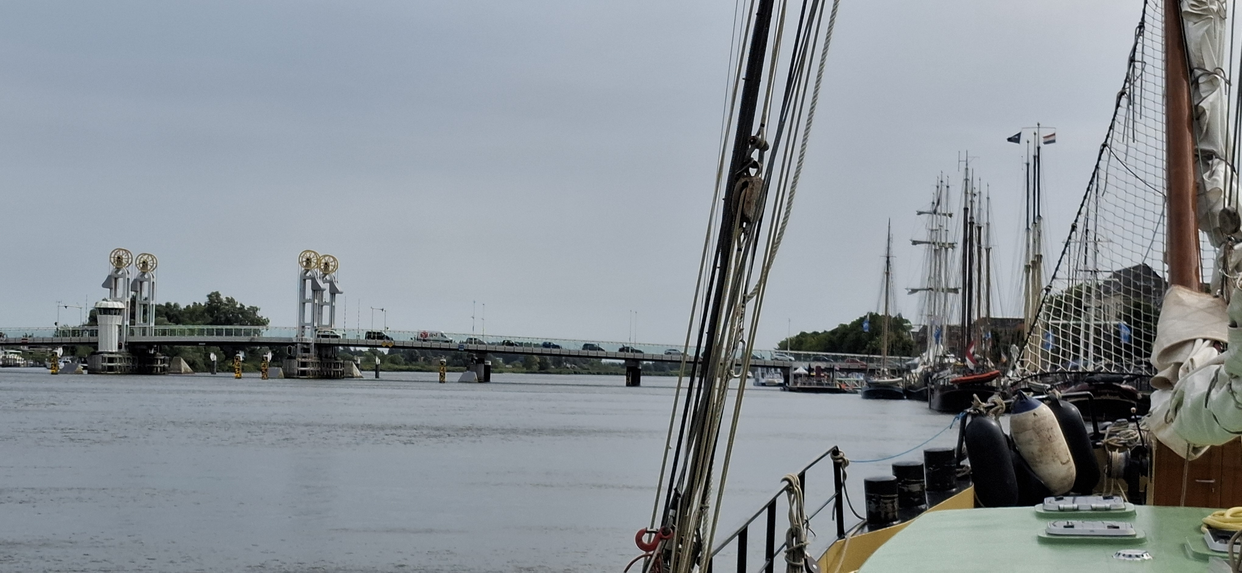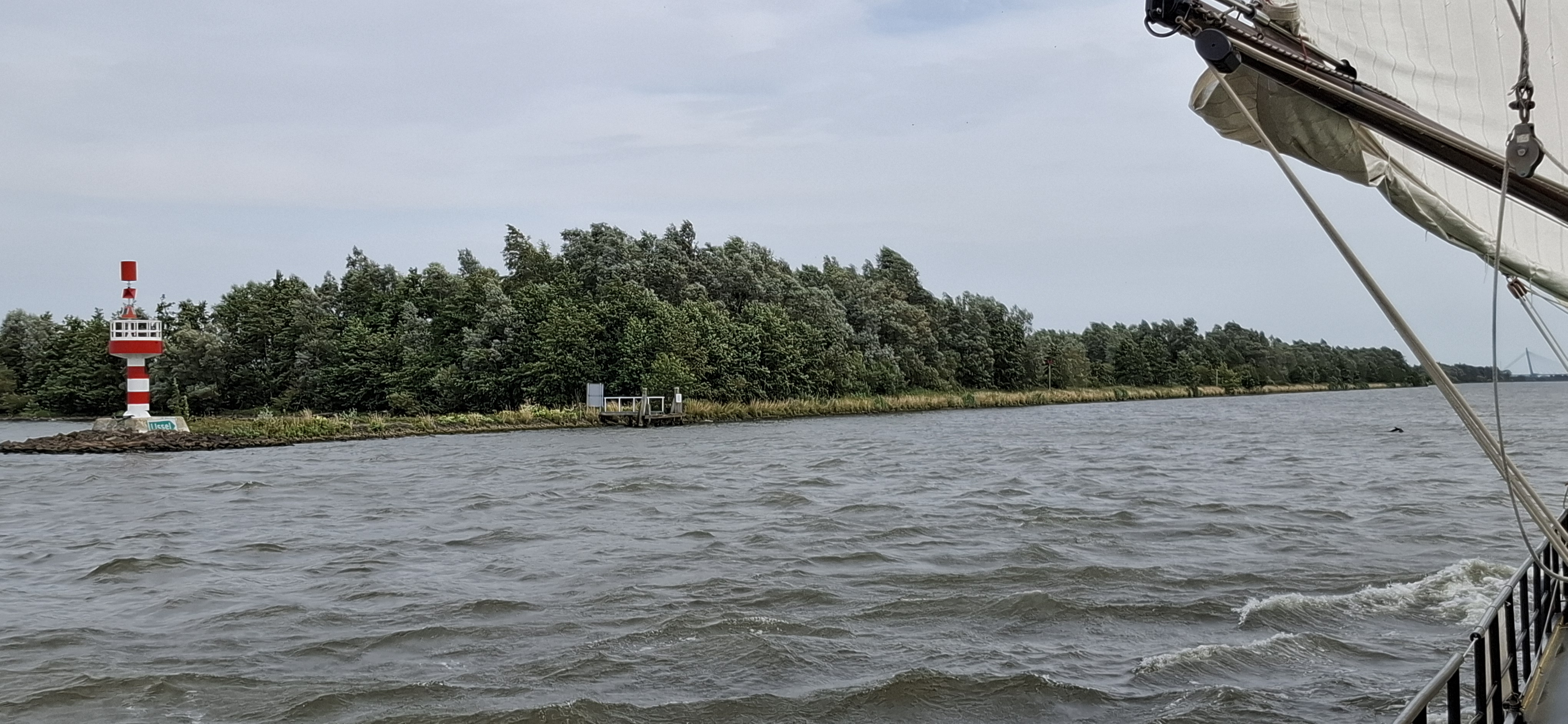 Nach der Ketelbrug unter Groß und Fock weiter durch das Ketelmeer nach Osten und dann die Abzweigung des Flusses Ijssel nicht vergessen. Vorn dort waren es nur noch 1005 Flußkilometer bis Basel. Als nächstes wieder Segel bergen vor der Eilandbrug. Danach dann nochmal kurz unter Groß und Fock nach Kampen. Dort Anlegen an der großen Pier mitten in der Altstadt. Ankuft ca. 16:30 Uhr.