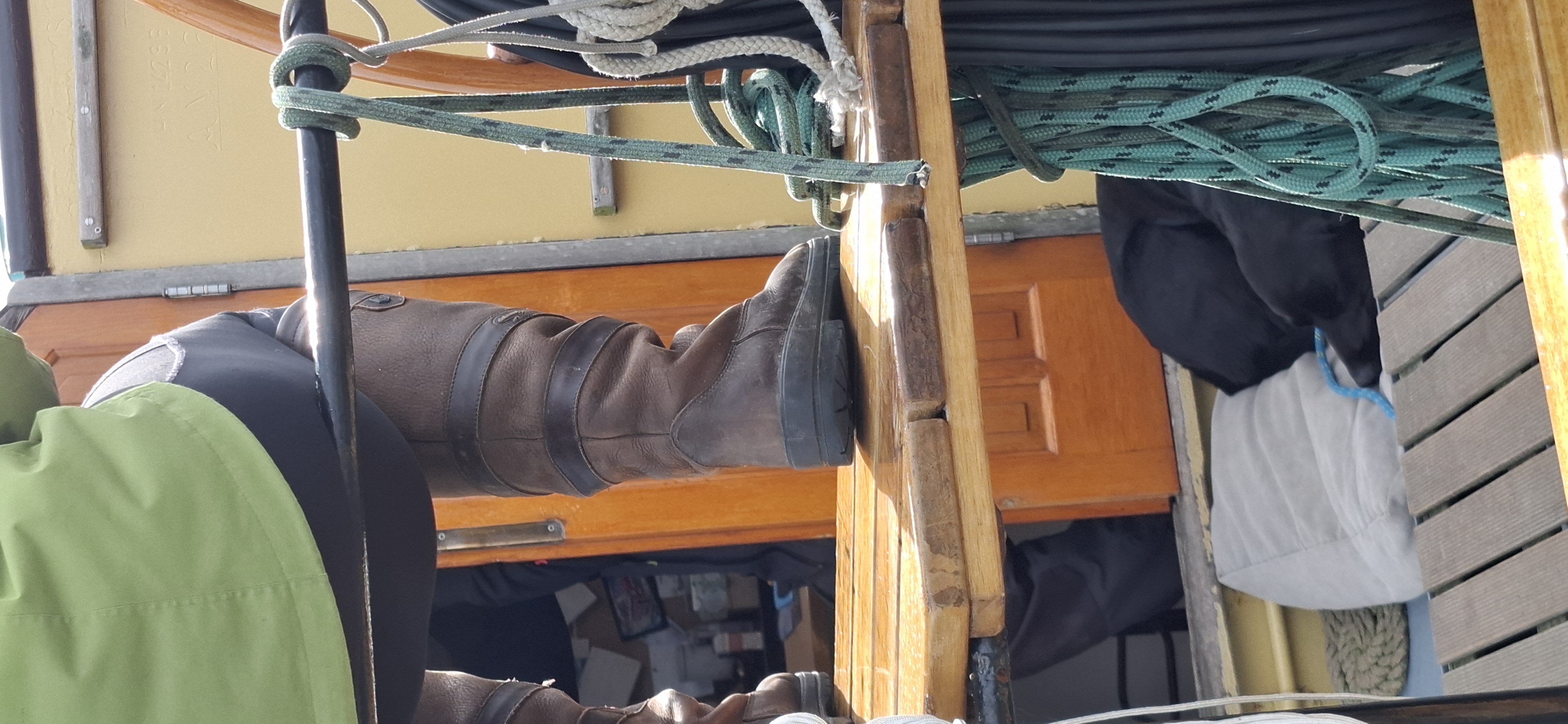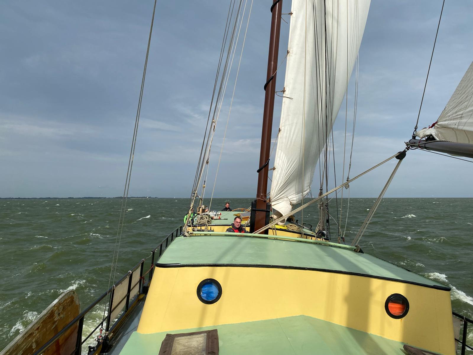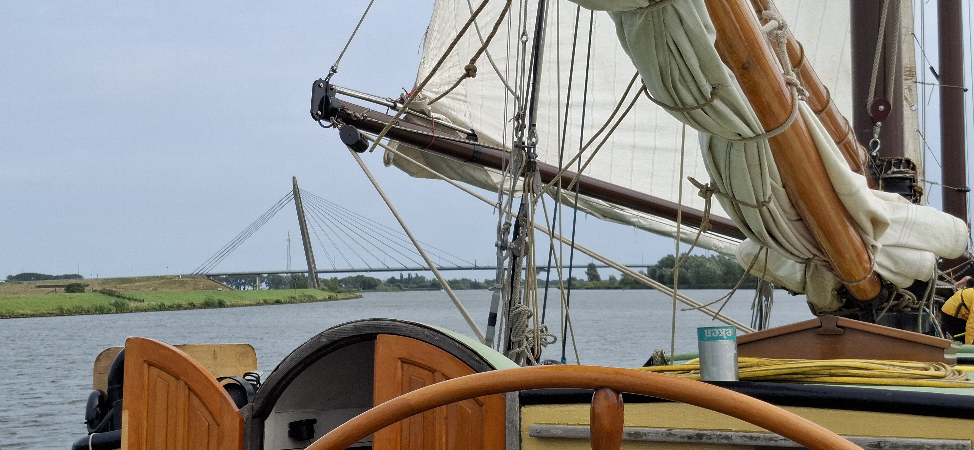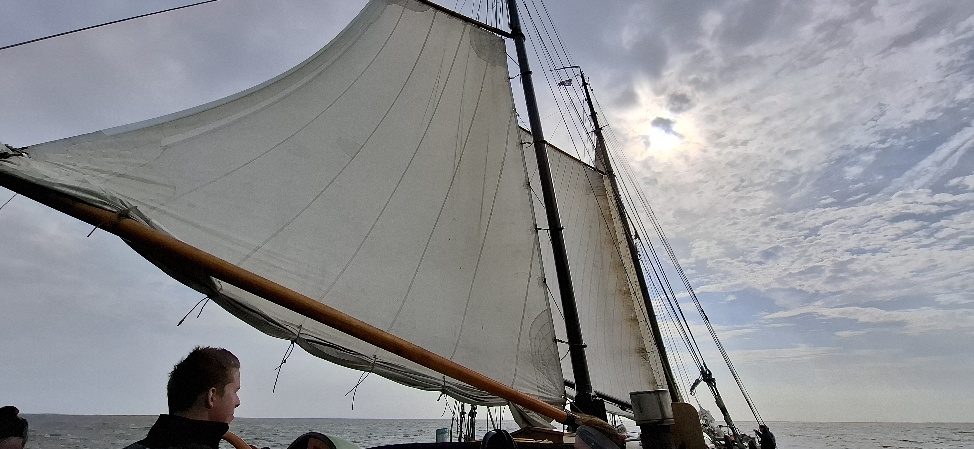 Frphstpck gab es dann um 8 und um 9:33 Uhr war auch Klaasjan abfahrbereit. Eine inzwischen sehr routinierte Crew hatte das noch immer gereffte Groß und die Fock schnell gesetzt. Dann ging es erst Richtung Enkuizen und weiter nach Südosst. Auf halbem Wege zur Ketelbrug kam auch noch der gereffte Besan dazu.