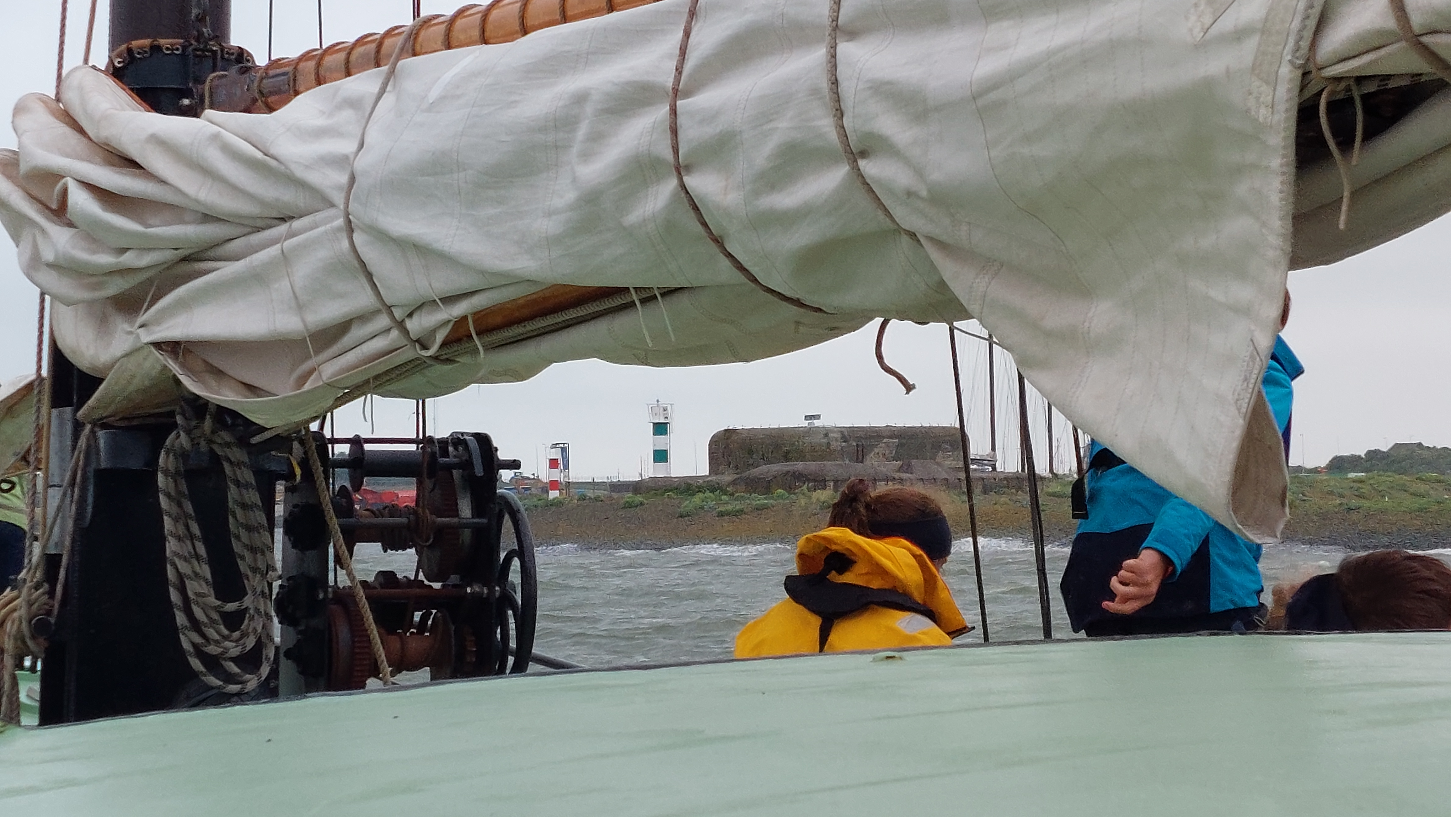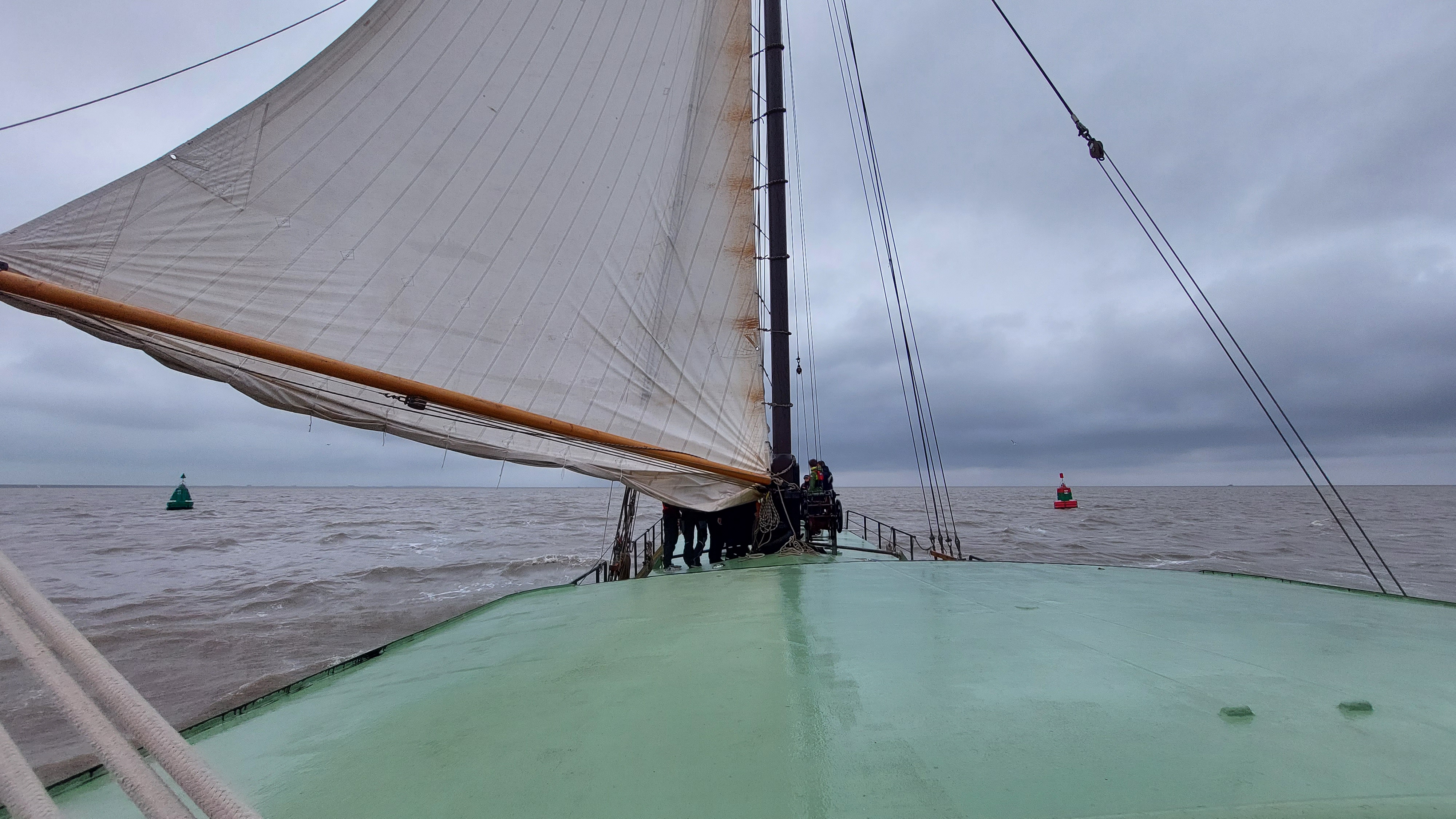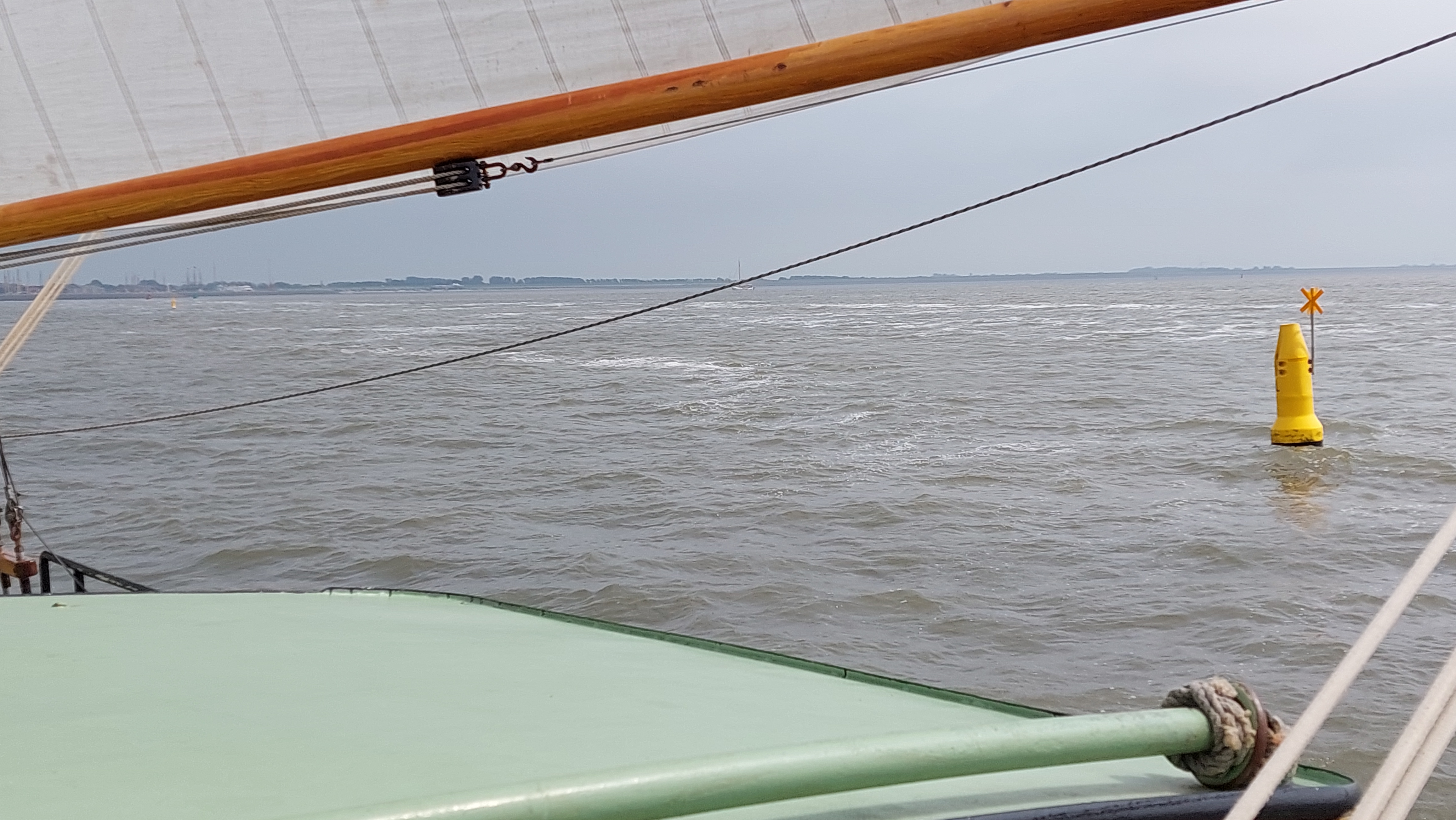 Es war ein supertoller Segeltag. Zwar noch immer diesig, aber wir hatten steten raumen und achterlichen Wind bei 4-5. Die auflaufende Tide gab und noch Extra-Schub.. Daher waren wir viel Schneller am Ziel als erhofft.