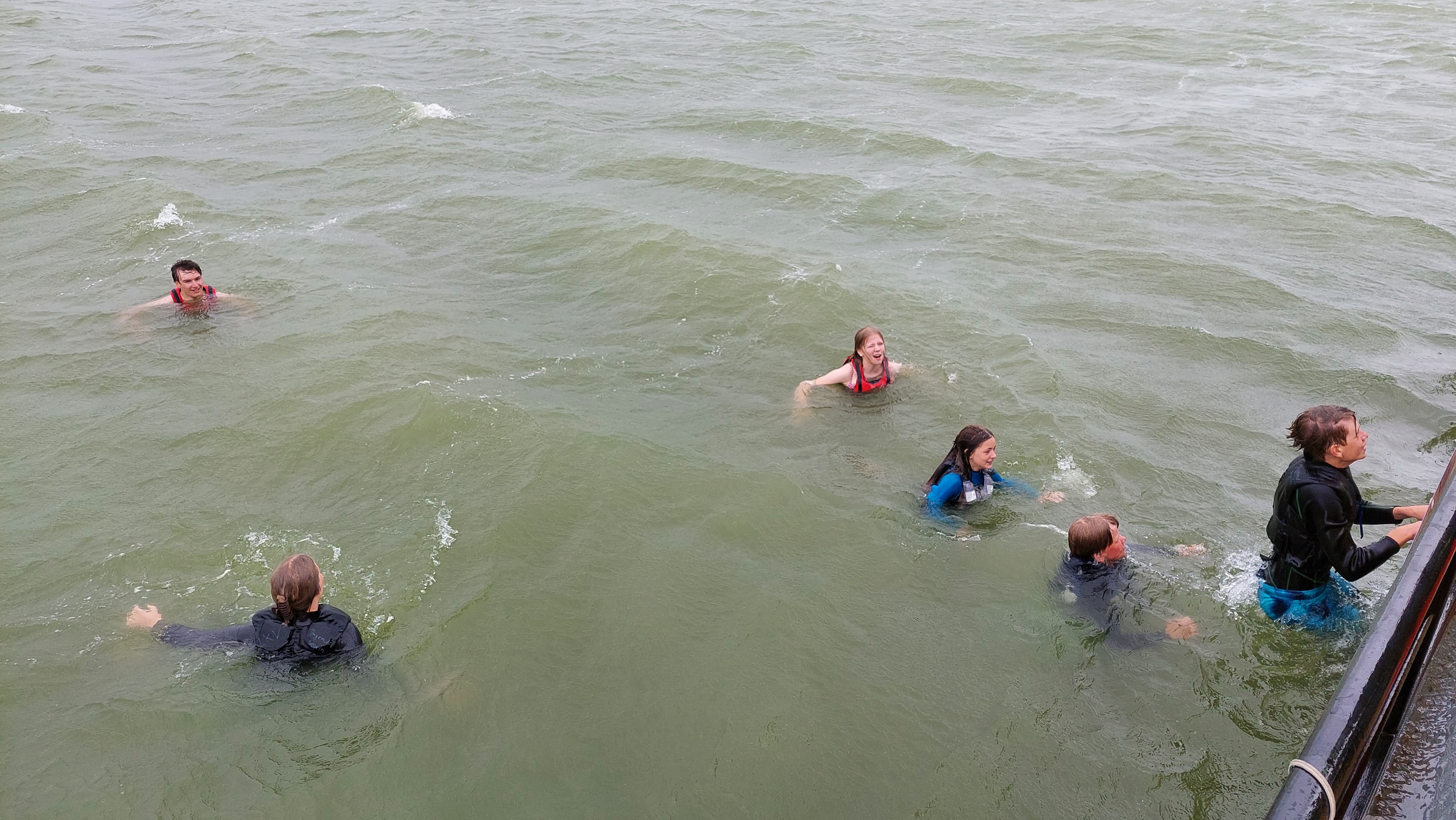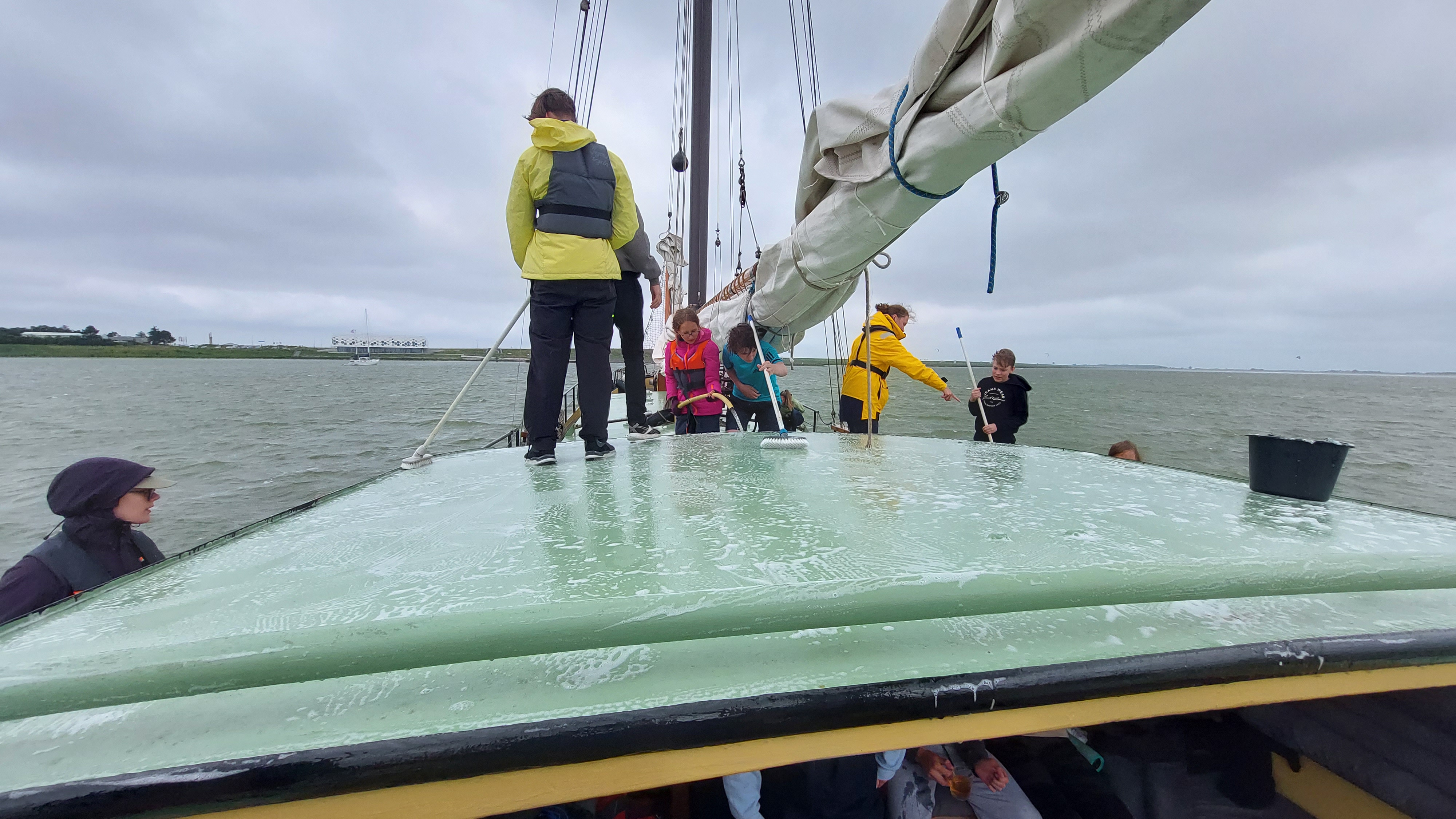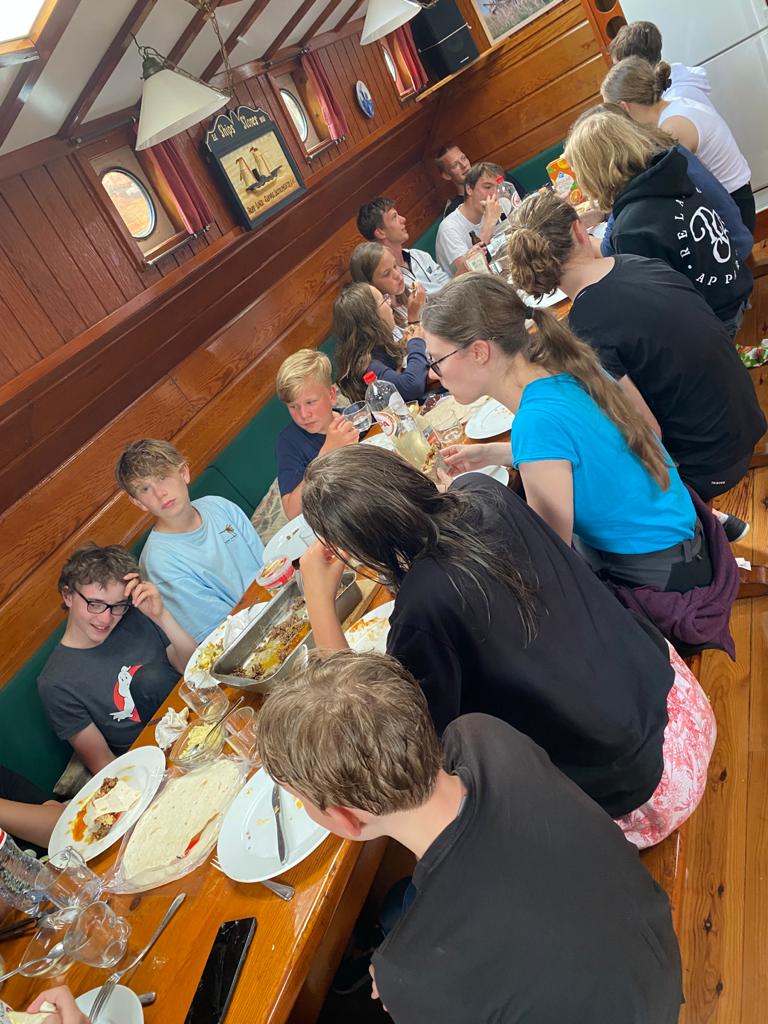 Direkt nach der Schleuse, auf Backbord im Schutz des Deichs, fiel der Anker und es konnte wieder ausgiebig vom Schiff aus gebadet werden. Über eine Stunde, dann wurde es Zeit aufzubrechen. Denn schließlich war fürs Abendessen schon frischer Kibbeling vorbestellt. Vorher aber noch eben die Reste der Spaghettis von gestern verdrückt.