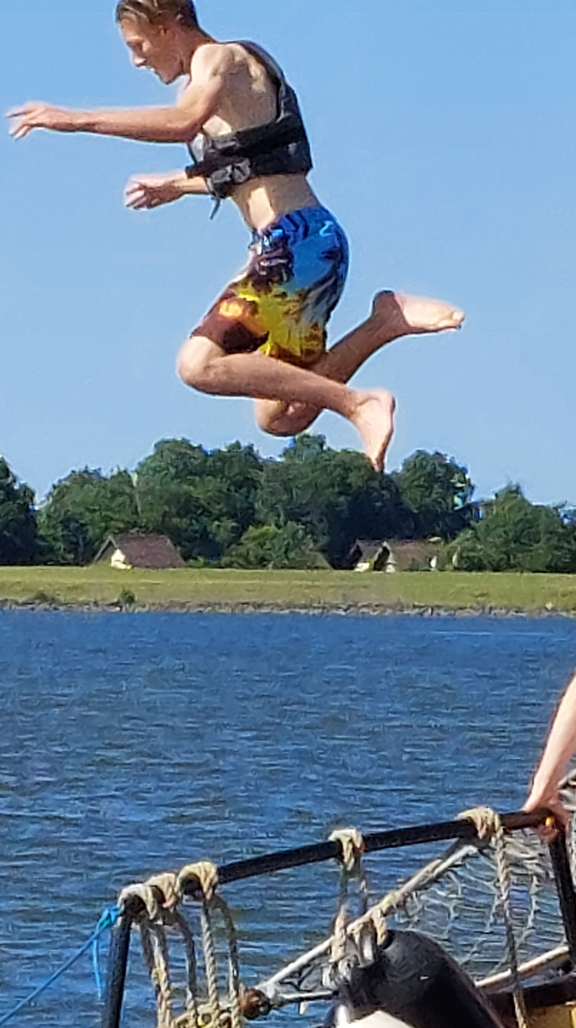 Auch Klaasjan freute sich sehr mit der eingespielten Crew im Kanal segeln zu können. Ein traumhaftes Binnen-Segelrevier! Kleine Marinas mit Ferienhöusern mir eigenem Bootssteg wechselten ab mit einfachen Häfen. Es herrschte reger Bootsverkehr, auch Segeltraining. Durch 2 Binnenseen kamen wir endlich zum Ziel. Take Tuka Island - offizielll "Langehoekspolle" im See "Fluessen"