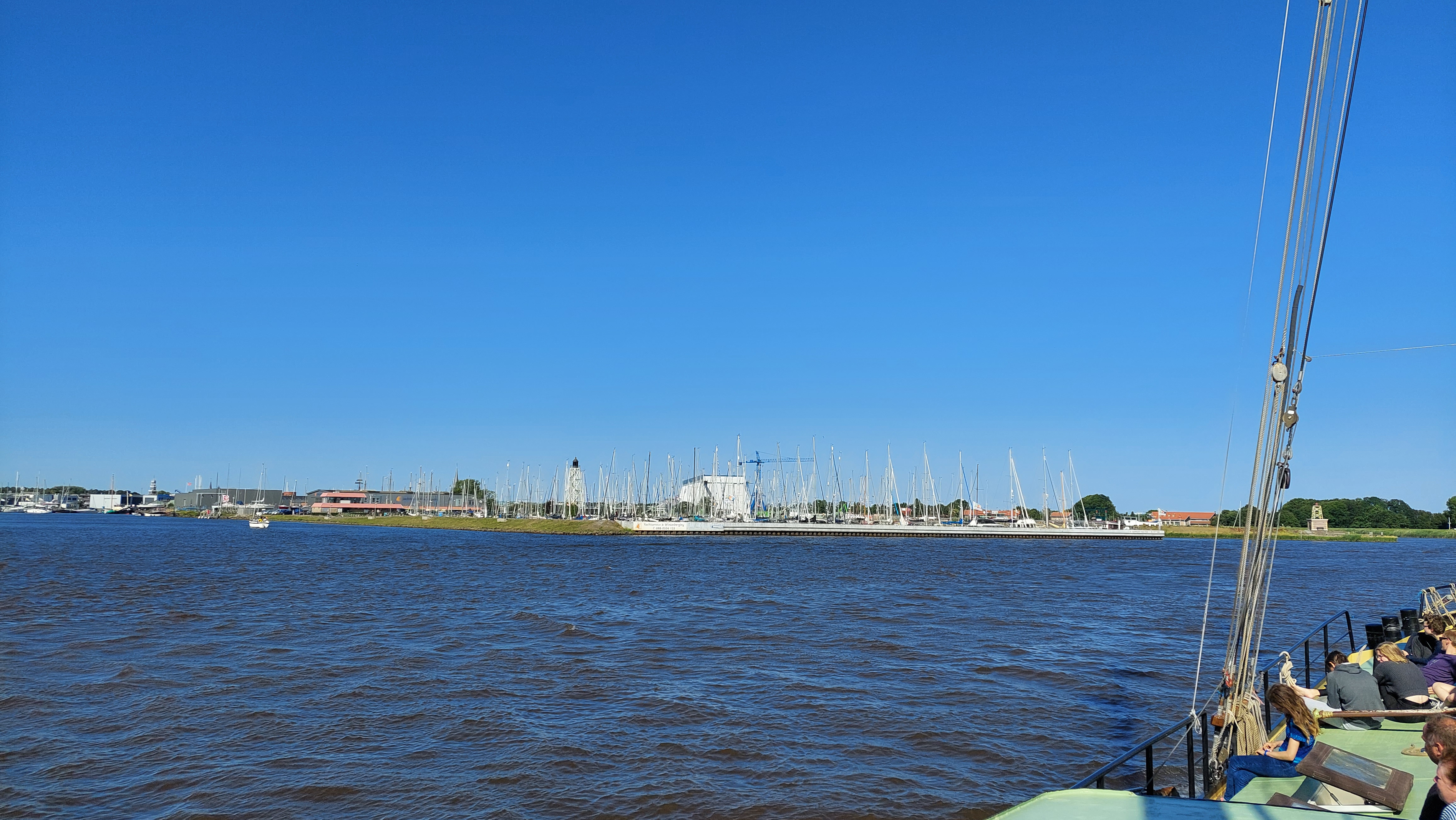 Zuerst unter Motor bis zur Schleuse vom Aflutdijk. Dann weiter motoren bis kurz vor Harlingen. Im großen Fahrwasser gingen dann alle Segel hoch bis auf den Klüver.