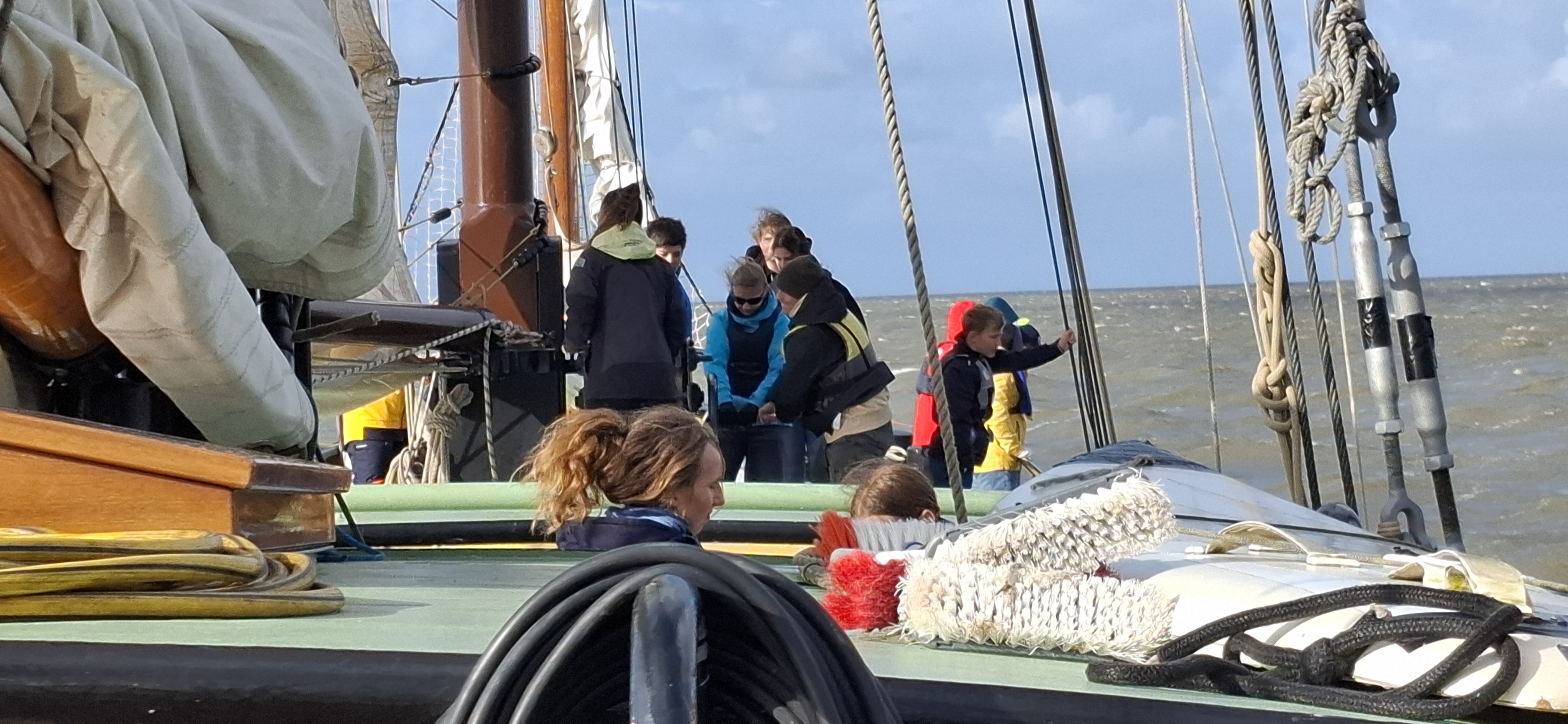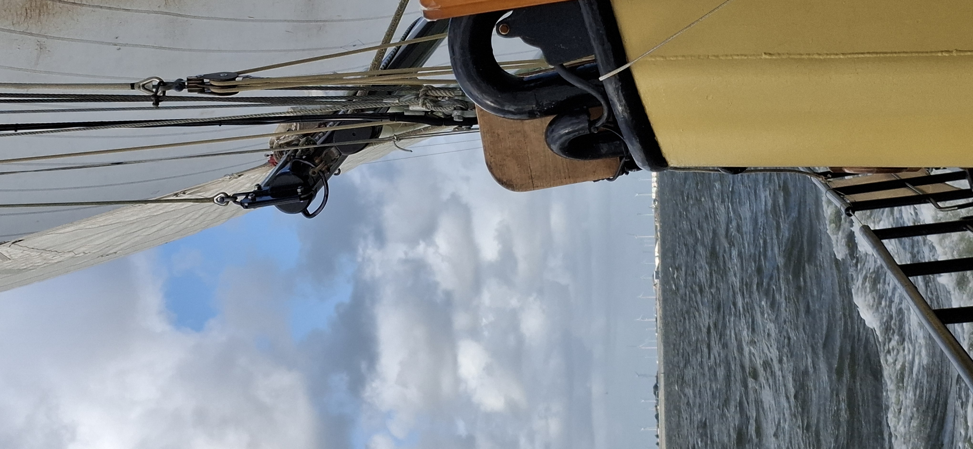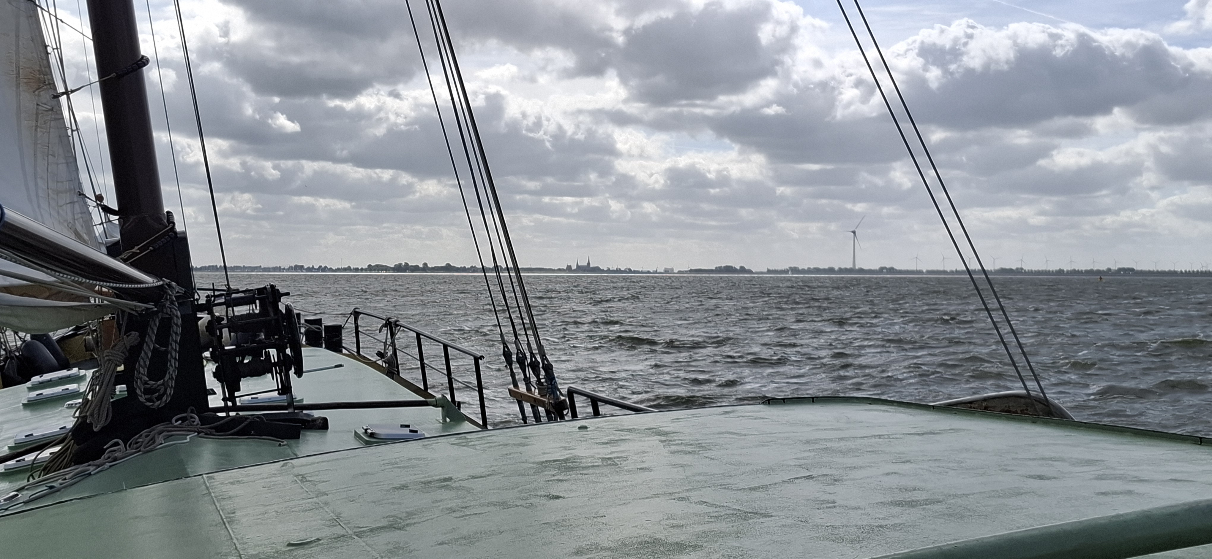 Im Hafen pfiff der Wind schon kräftig, im Außenhafen trafen uns die 5 mit stärkeren Böen. In weiser Voraussicht hatten wir gestern schon mal Groß und Besan gerefft. Heute erst mal nur Groß und Fock gesetzt. Dann hoch am Wind Richtung Schleuse Kornwarderzand.