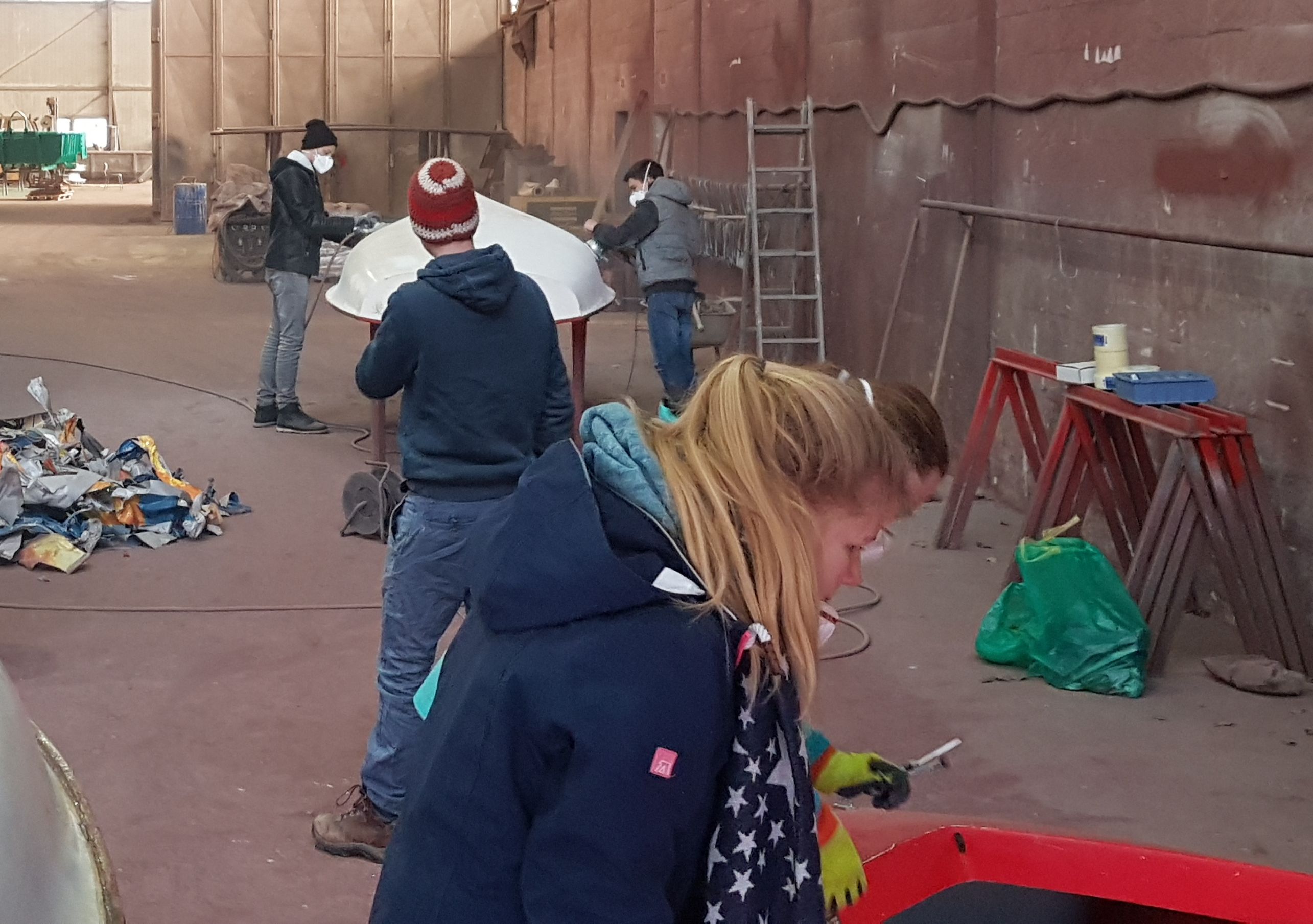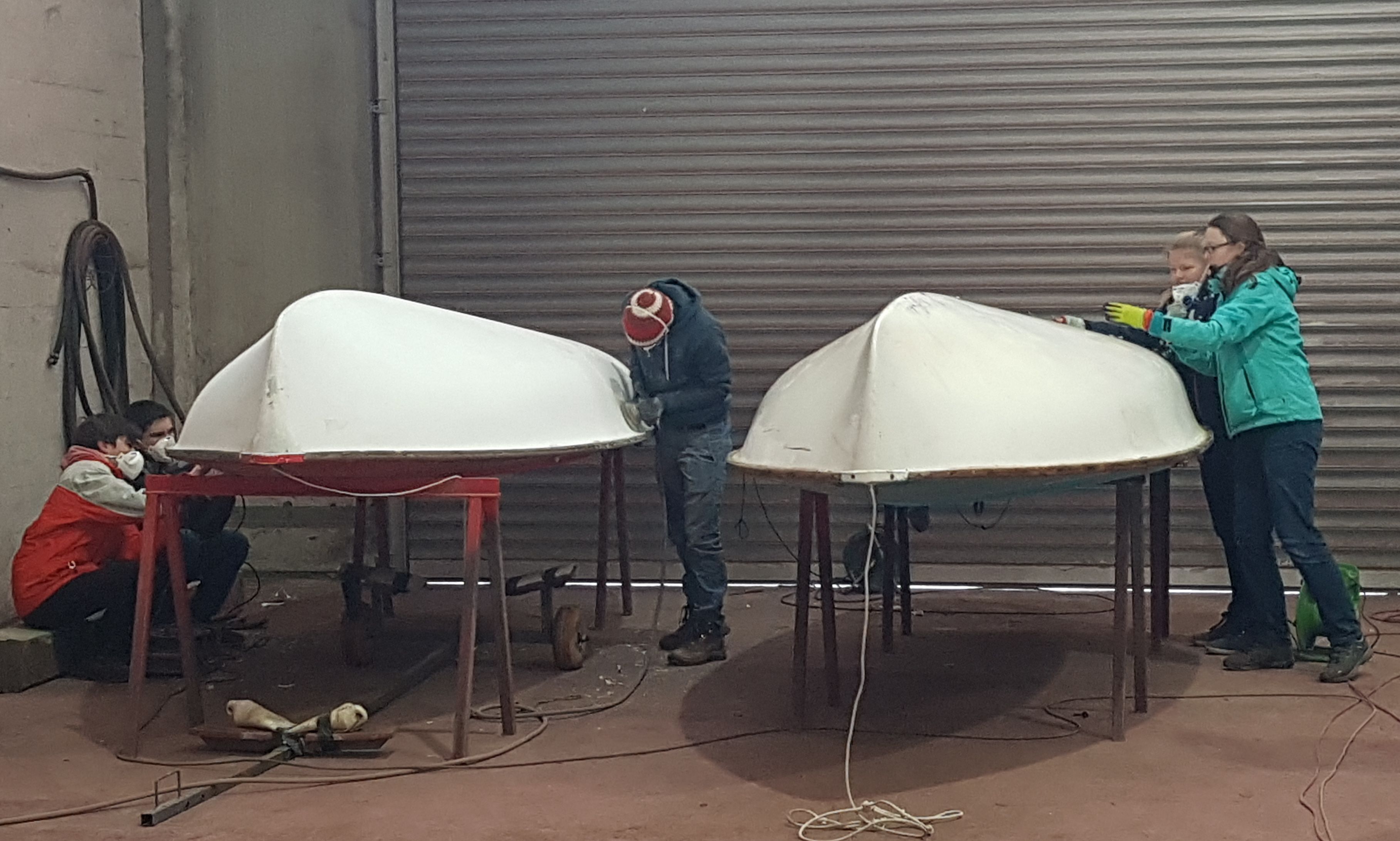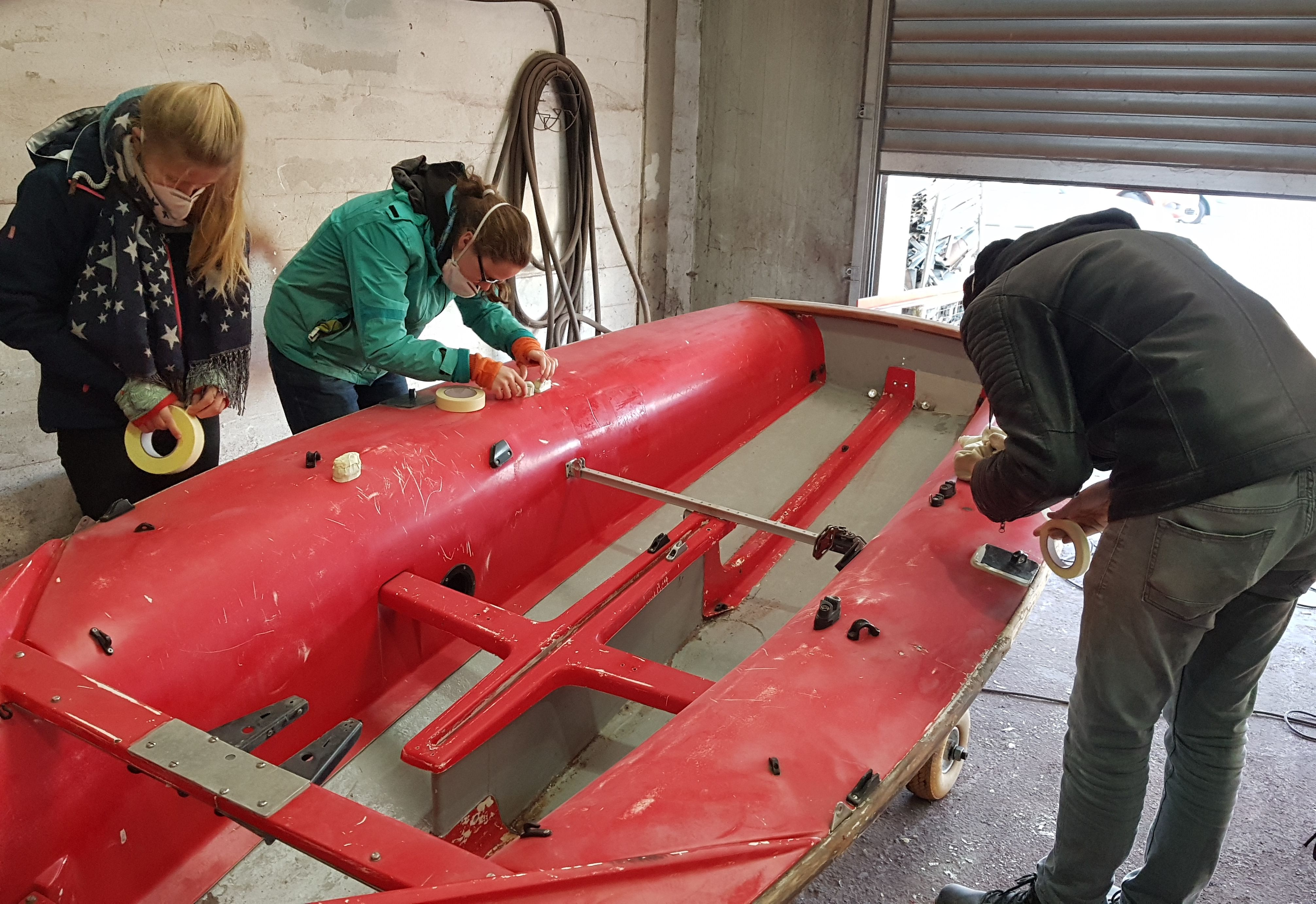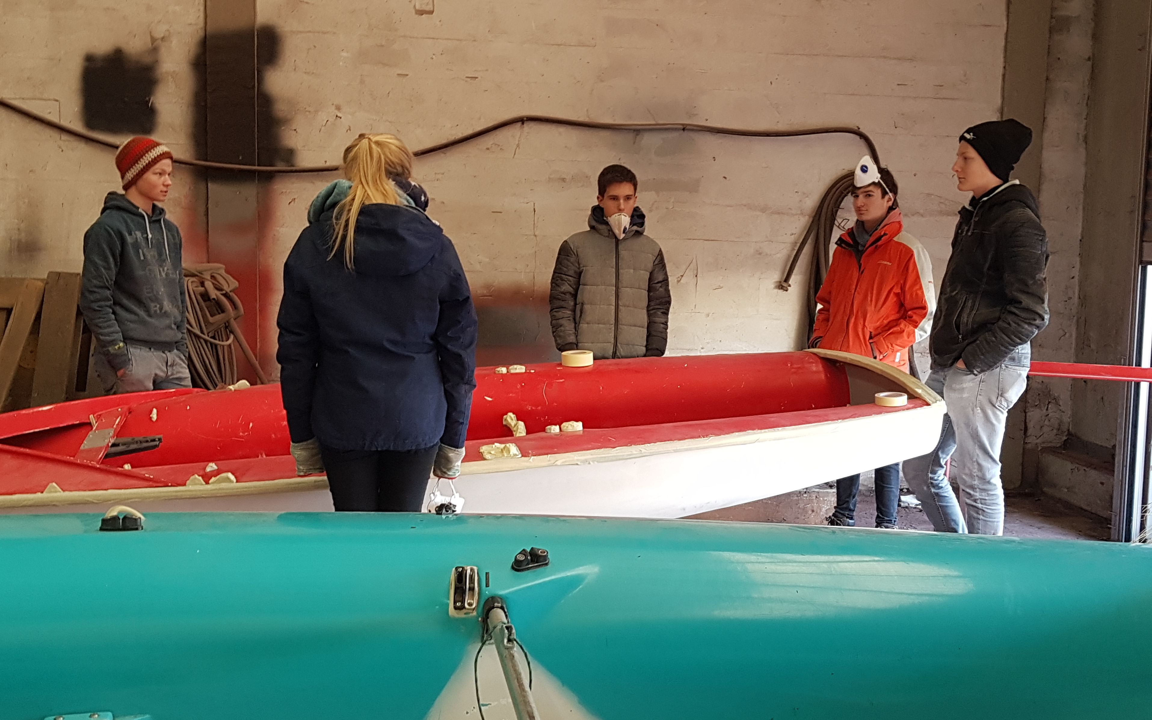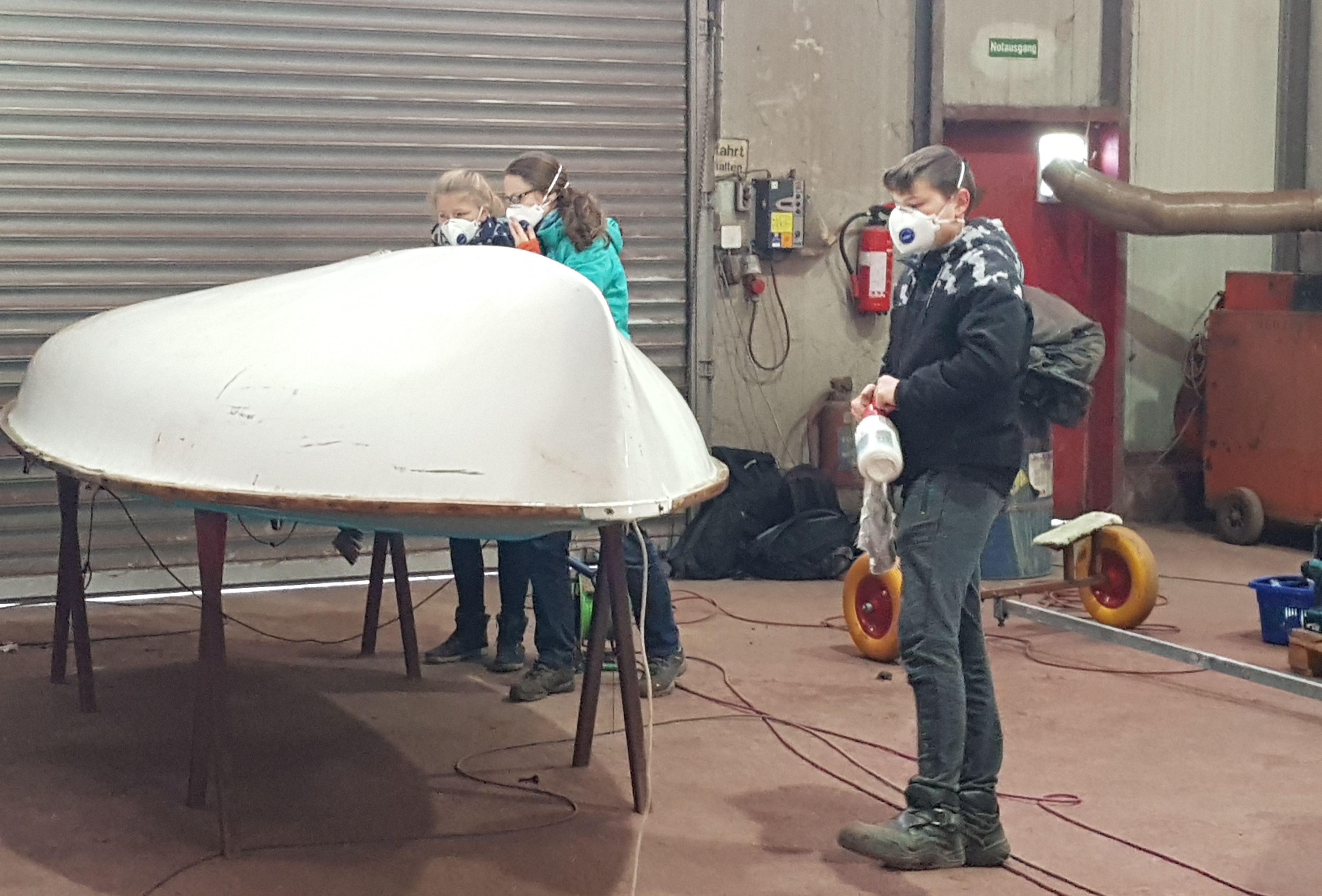 Insgesamt 7 unserer älteren Sailkids waren mit viel Einsatz dabei die Boote fürs Lackieren fertig zu machen - also Anbauteile demontieren, Deck und Rumpf schleifen und alles abkleben, was nicht demontiert werden konnte. Zum Glück waren bei Frost außen die Temperaturen in der Halle erträglich.