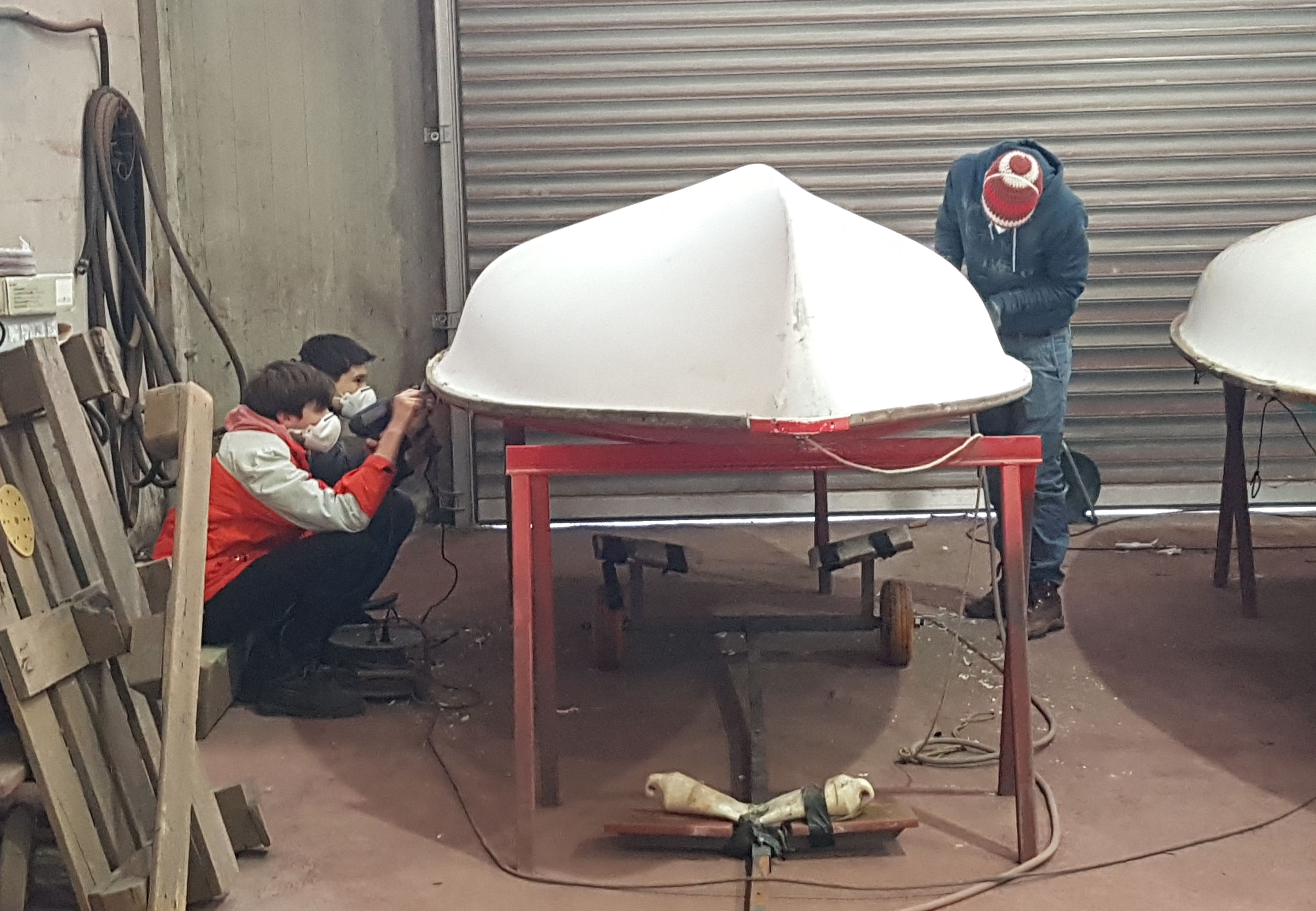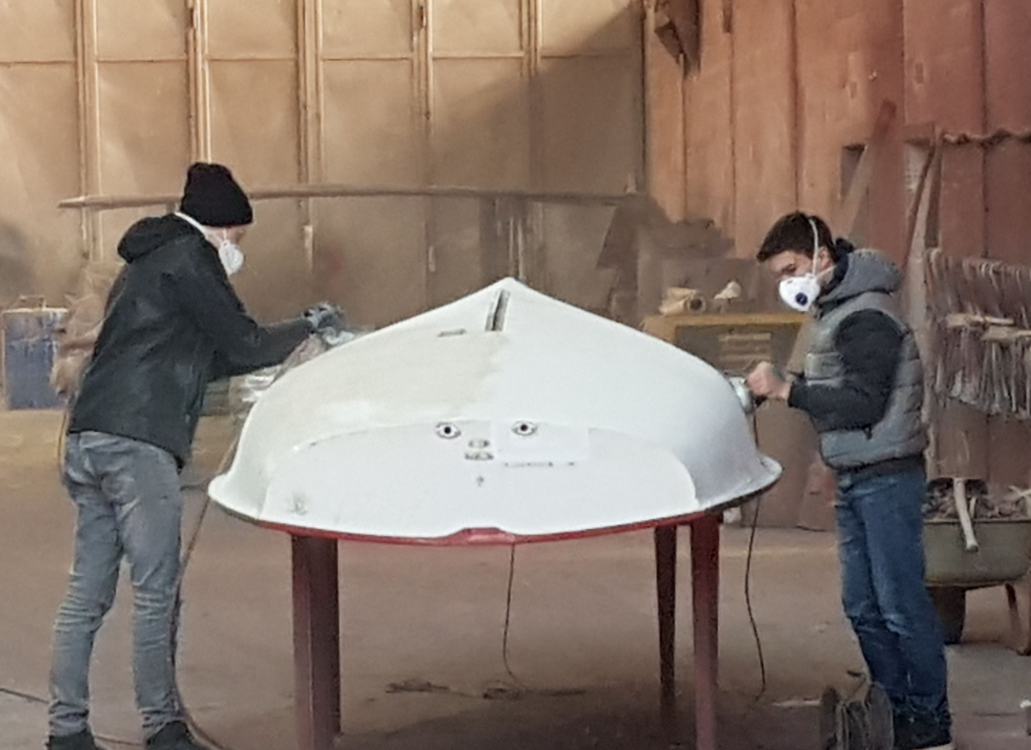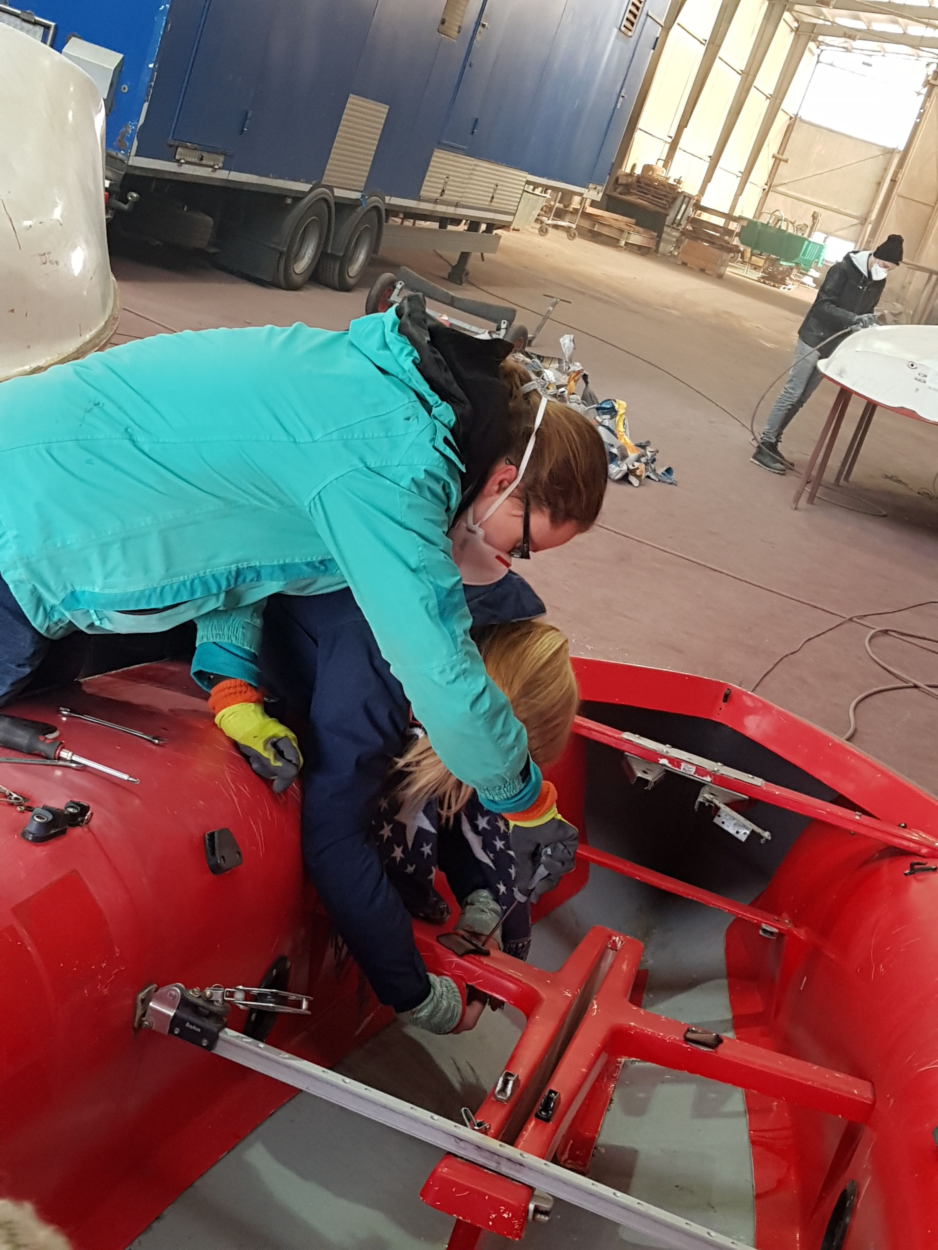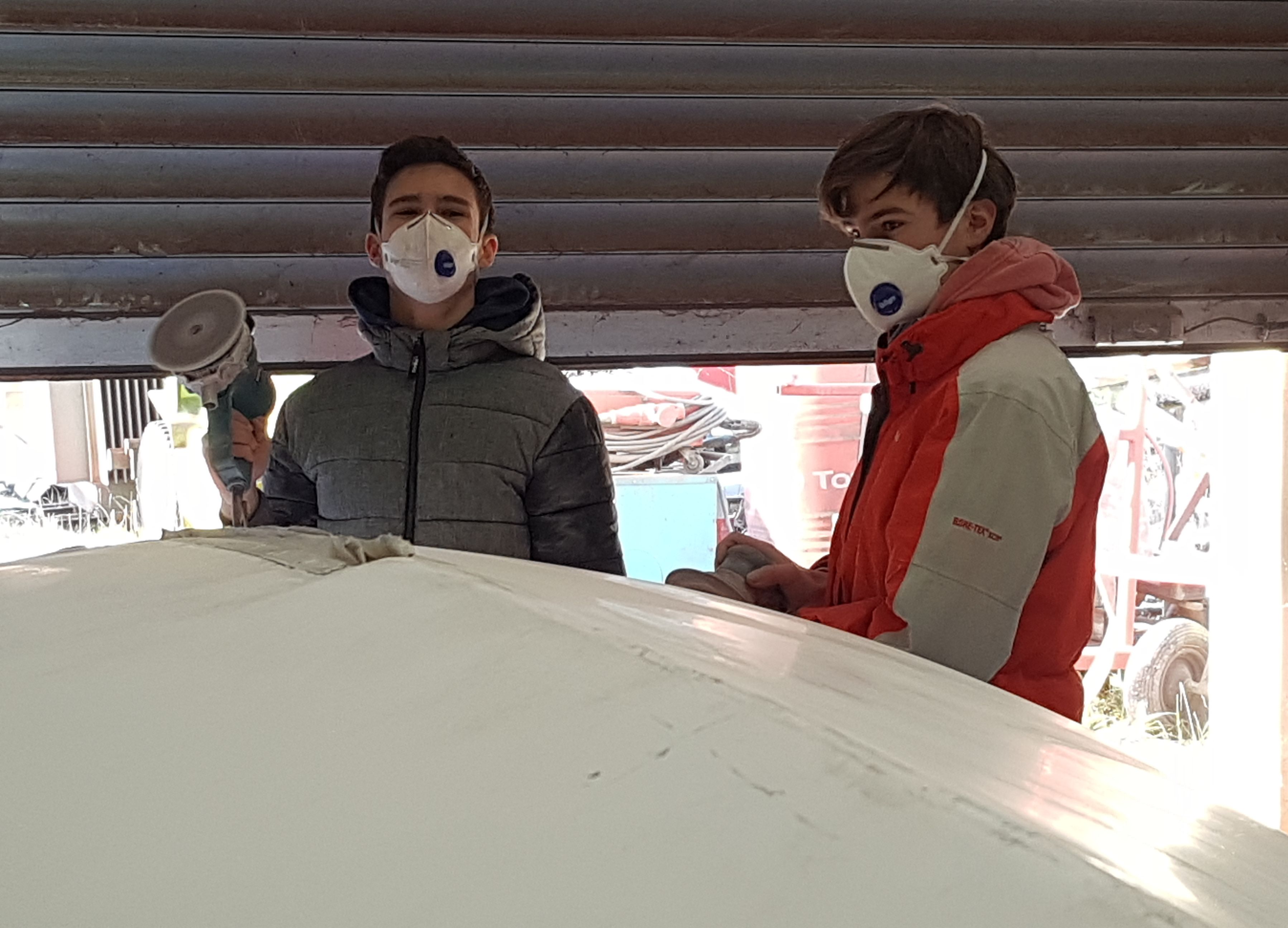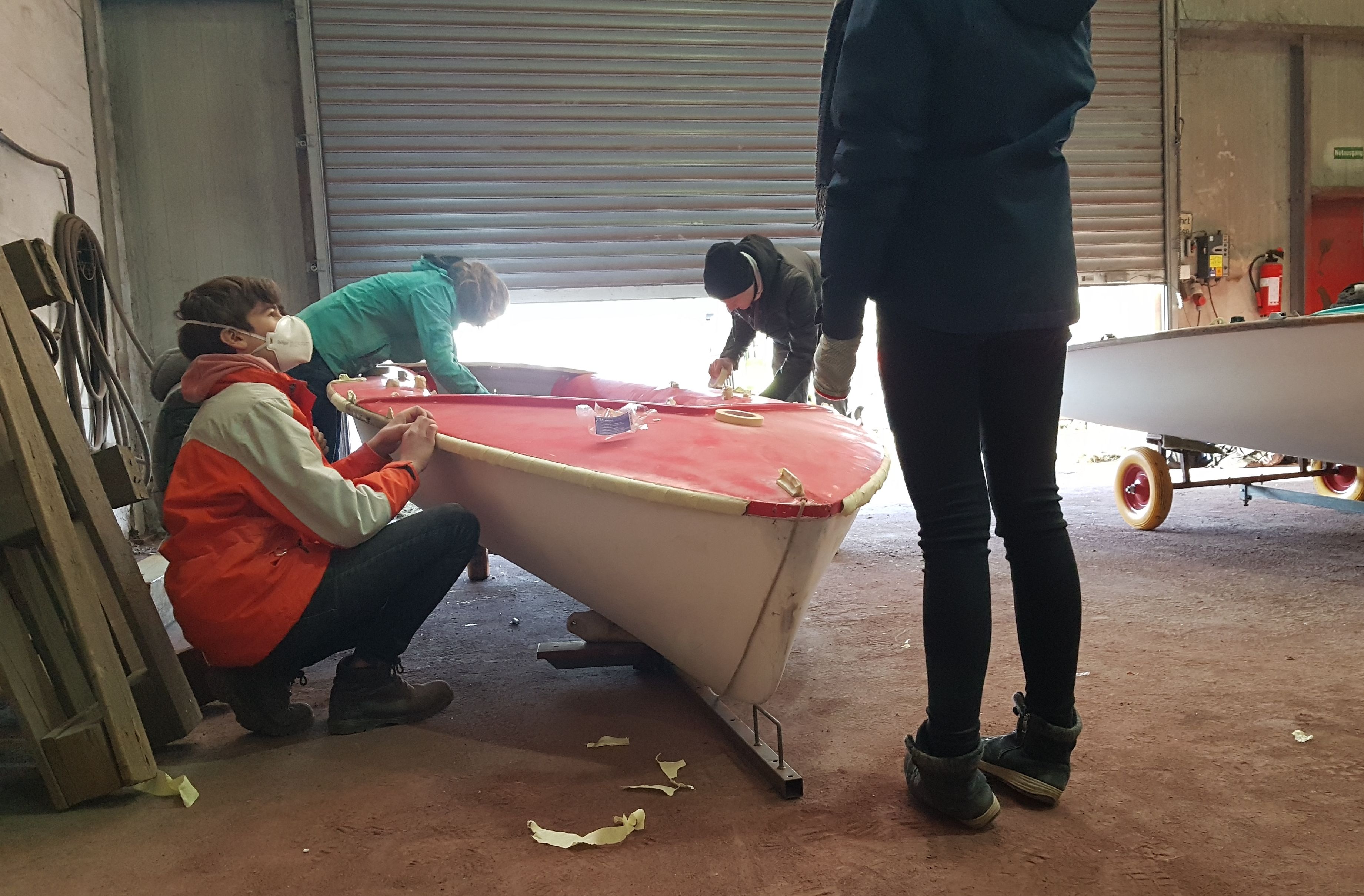 Insgesamt 7 unserer älteren Sailkids waren mit viel Einsatz dabei die Boote fürs Lackieren fertig zu machen - also Anbauteile demontieren, Deck und Rumpf schleifen und alles abkleben, was nicht demontiert werden konnte. Zum Glück waren bei Frost außen die Temperaturen in der Halle erträglich.